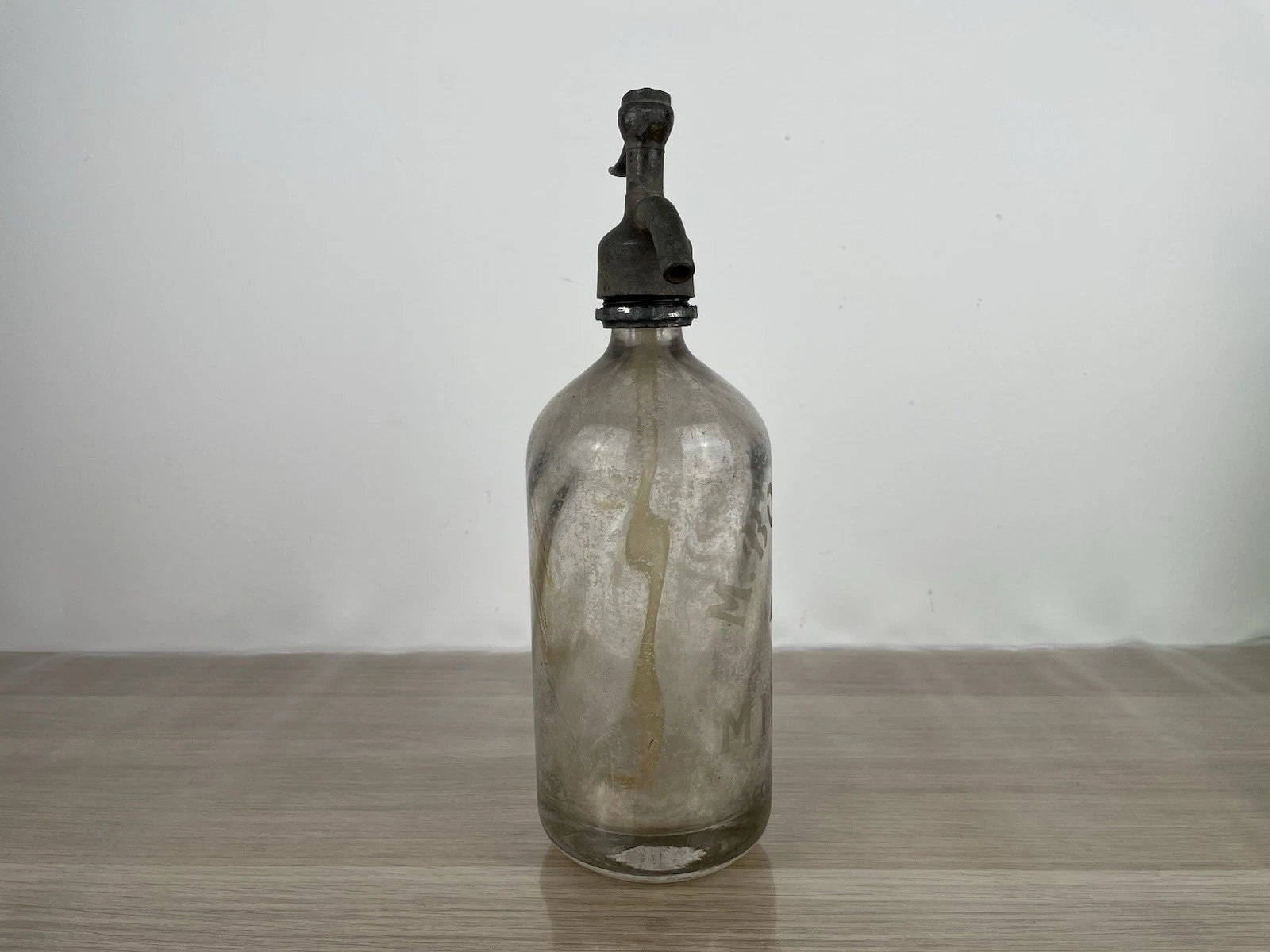 Antico sifone per seltz M. Bozzetti Milano, epoca stimata anni '30. Bellissimo colore trasparente bianco, in vetro spesso, con dosatore.