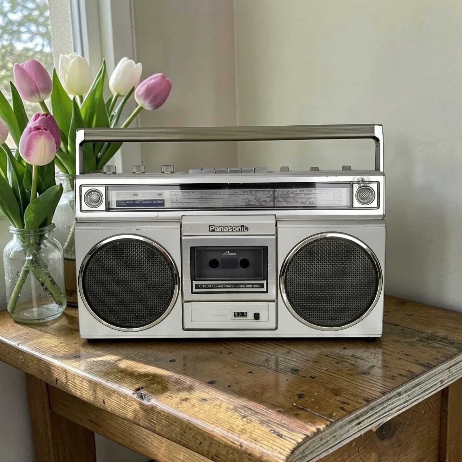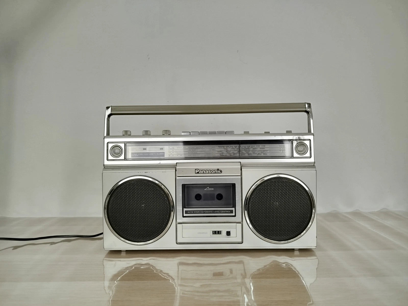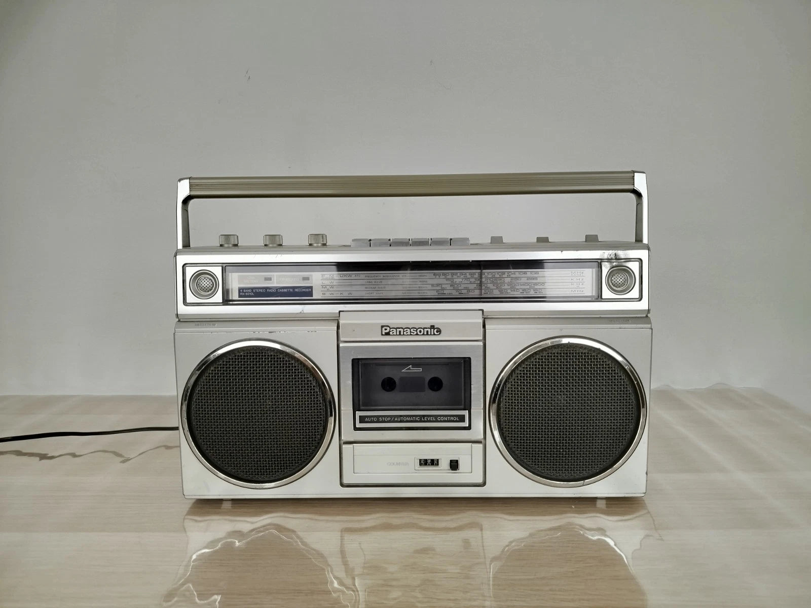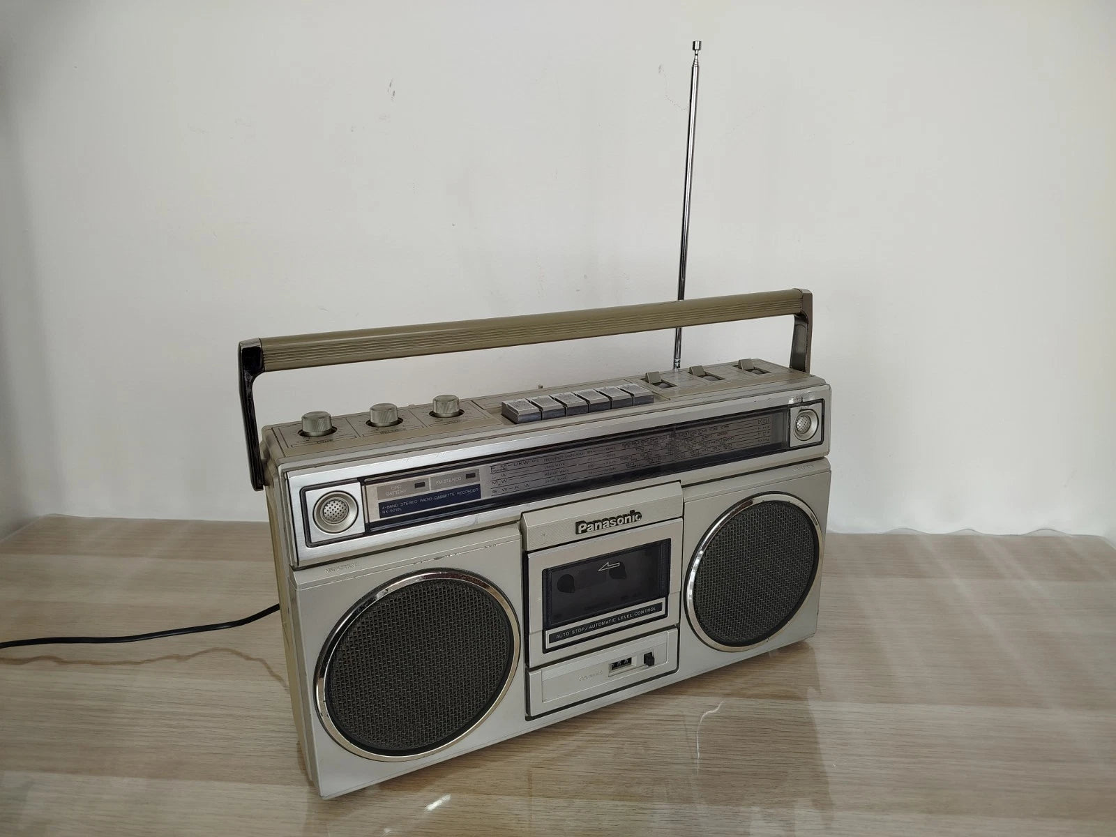 Boombox ghettoblaster radio portatile Panasonic RX-5010L, prodotta nel 1981 a Singapore da Panasonic, colore argento, con antenna, funzionamento a batterie (non incluse) e cavo di alimentazione.