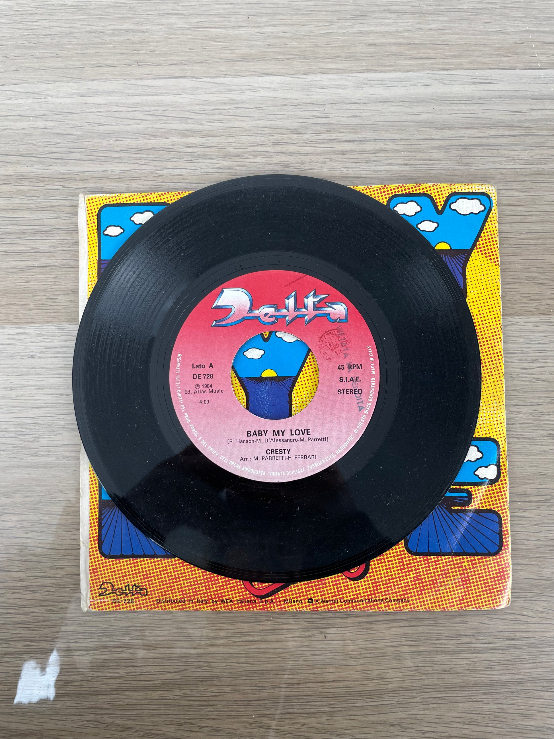 Disco 45 giri "Baby My Love". Singolo originale su vinile 45 giri – 7″ del progetto Cresty con i brani Baby My Love (Lato A) e On My Mind (Lato B). La traccia Baby My Love è tipica delle produzioni dance-pop italo/disco europee dei primi anni ’80, con ritmo ballabile e sonorità synth-orientate. On My Mind è la traccia complementare presente su molte edizioni del singolo.