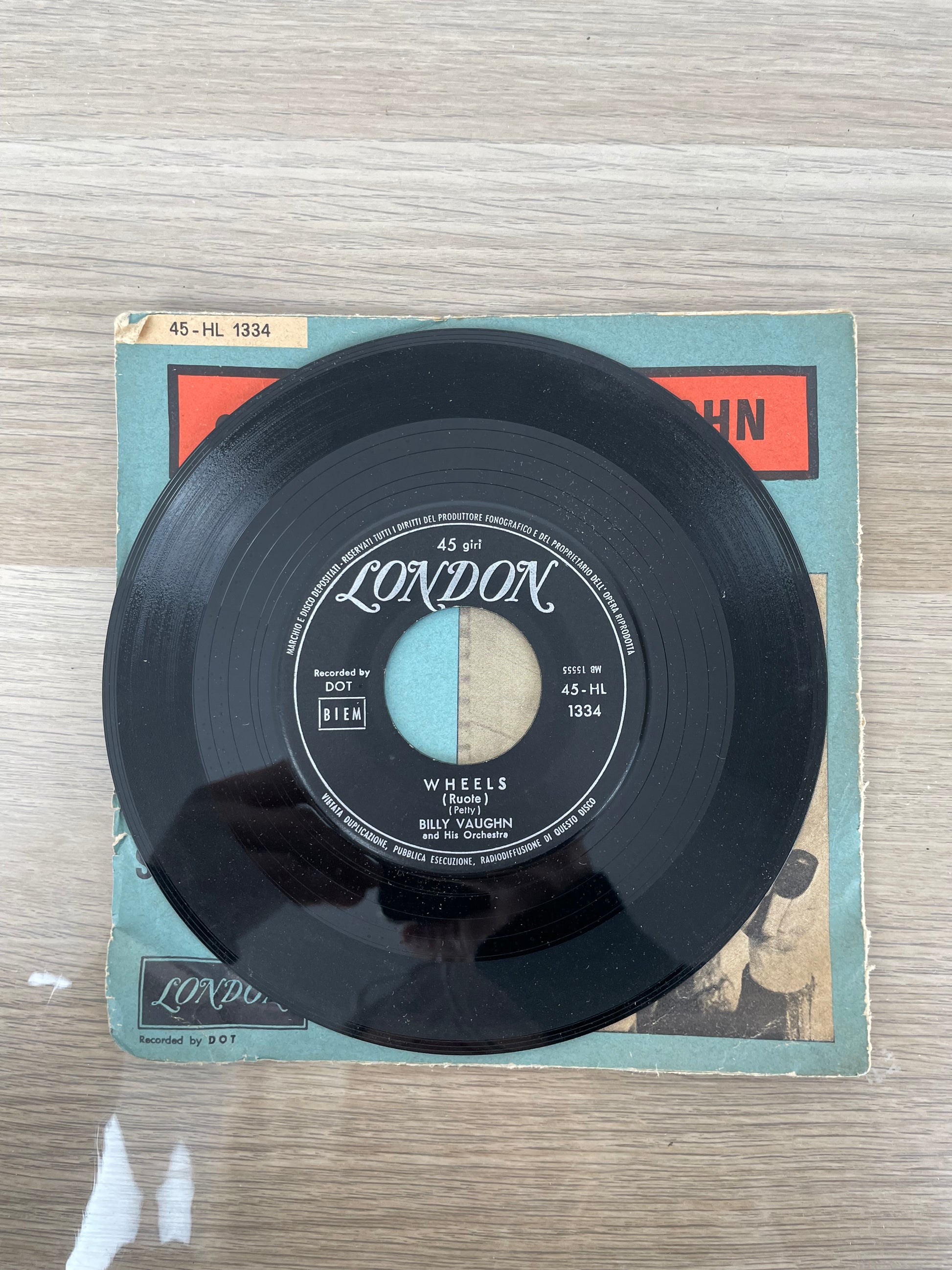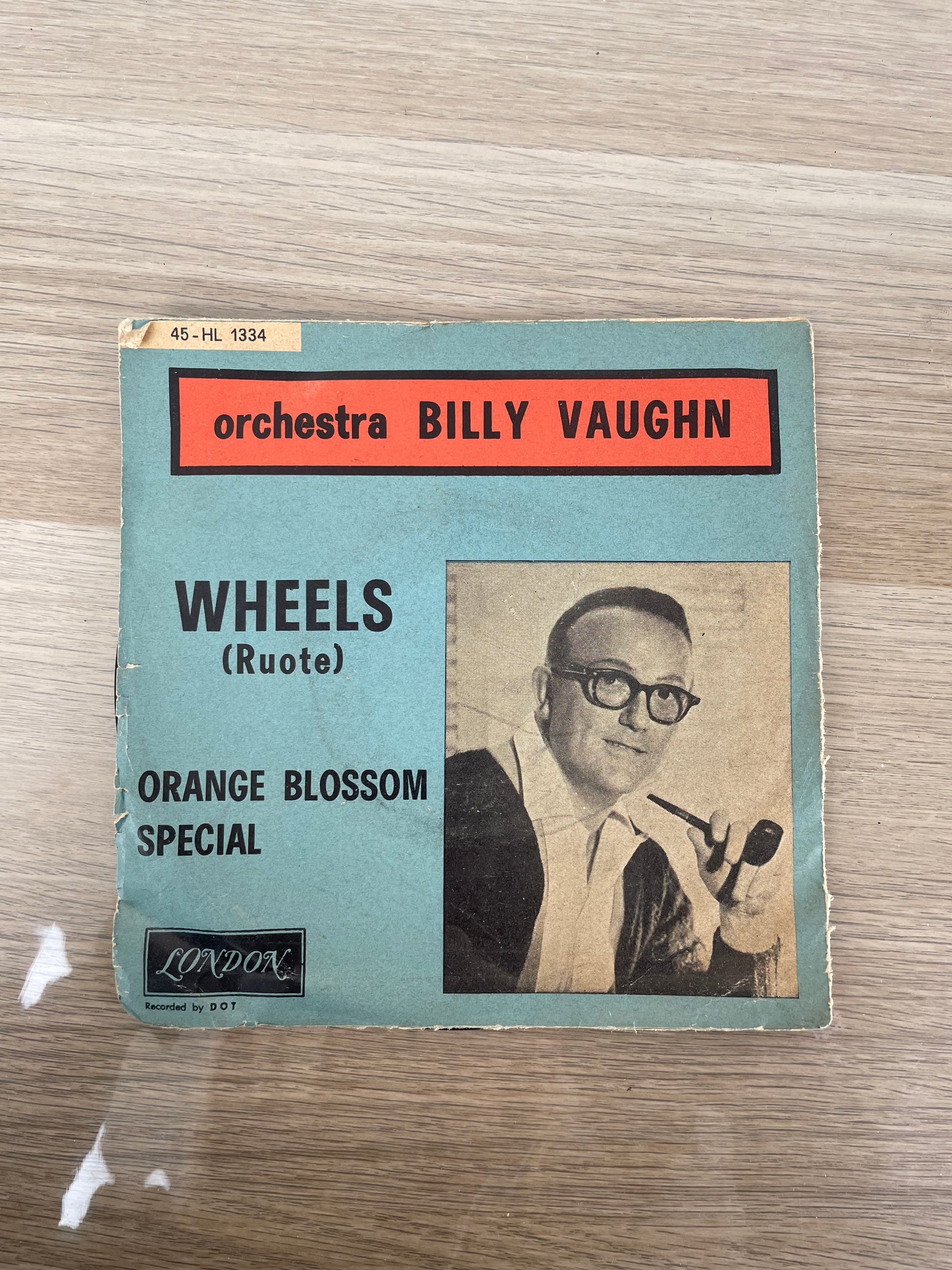 Disco 45 giri "Wheels". Singolo originale su vinile 45 giri – 7″ di Billy Vaughn & His Orchestra, pubblicato in varie edizioni europee con Wheels sul lato A e Orange Blossom Special sul lato B. Wheels è una versione strumentale orchestrale del celebre brano pop‑strumentale che ha avuto successo internazionale all’inizio degli anni ’60, e Orange Blossom Special è un altro classico strumentale ispirato alla melodia tradizionale resa famosa da numerosi artisti. Entrambi i pezzi riflettono il tipico stile easy‑listening di Vaughn, con arrangiamenti orchestrali morbidi e melodici.