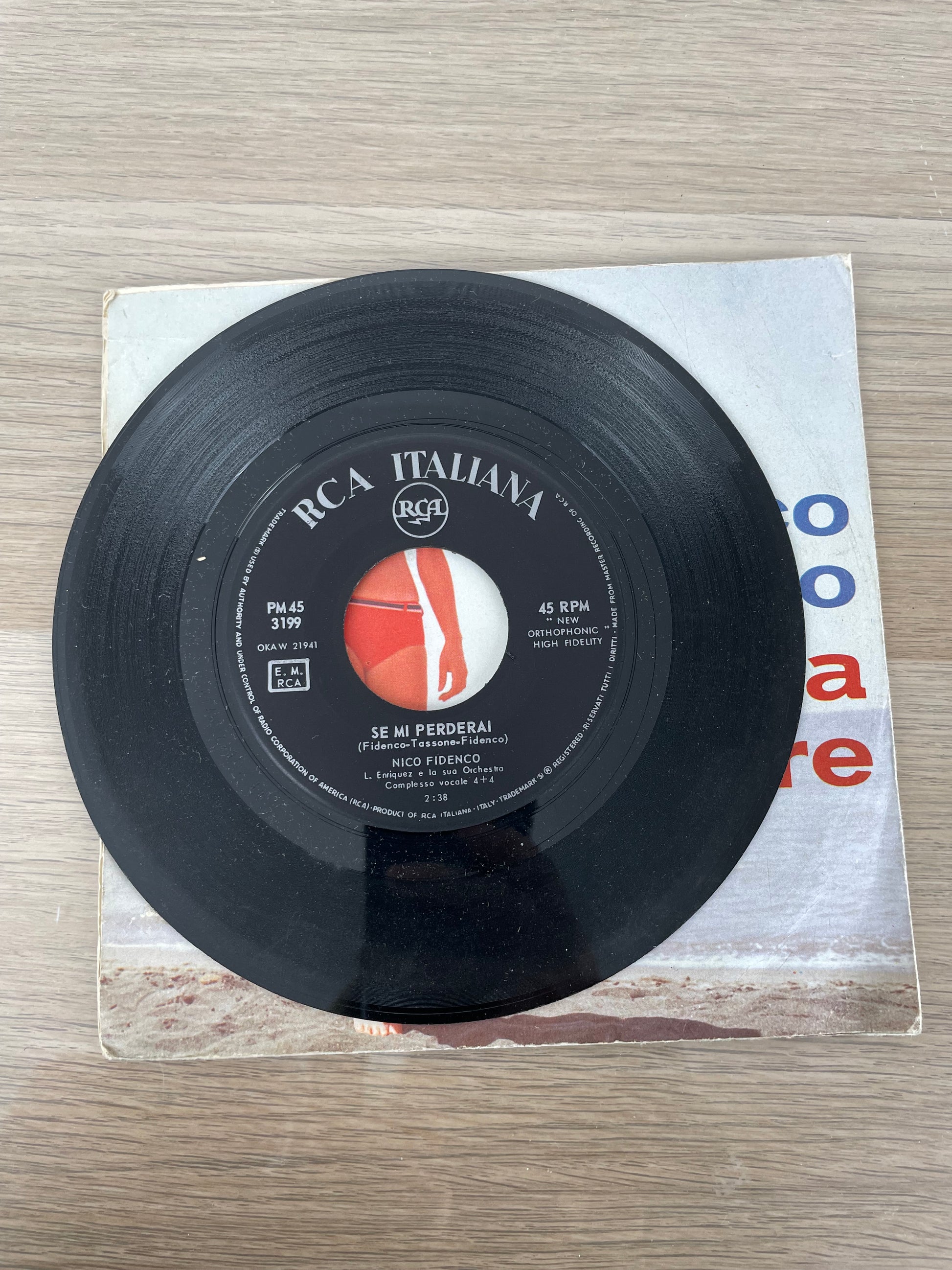 Disco 45 giri "Se mi perderai", uno dei brani d’amore più noti di Nico Fidenco, pubblicato come singolo nel 1963; Fidenco fu una figura importante della musica leggera italiana degli anni ’60 con numerosi successi radiofonici e discografici.