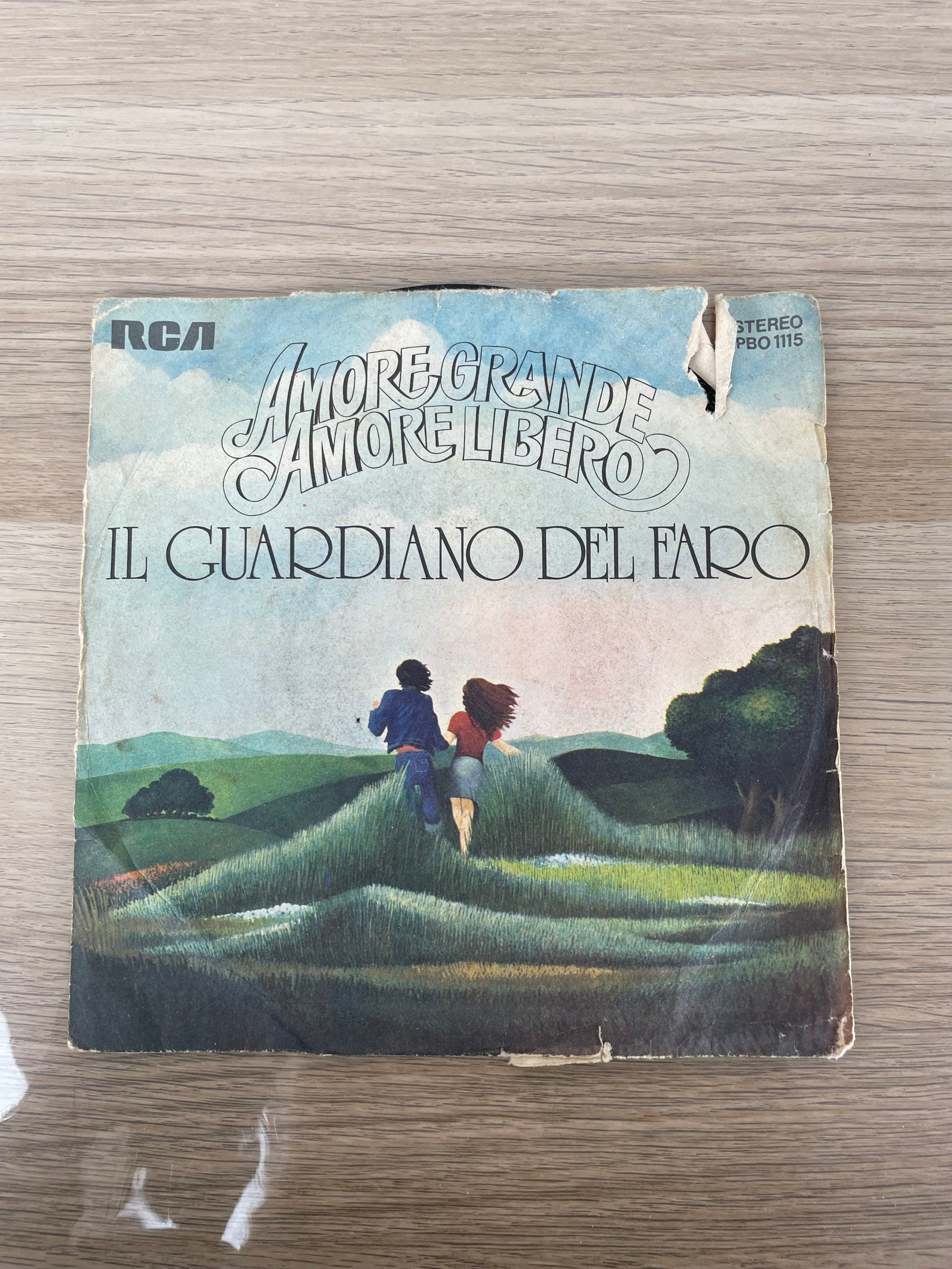 Disco 45 giri "Amore Grande, amore Libero". Singolo originale su vinile 45 giri de Il Guardiano Del Faro, progetto musicale guidato da Federico Monti Arduini, molto popolare nella musica italiana degli anni ’70. Amore Grande Amore è un brano intenso e romantico, caratterizzato da arrangiamenti orchestrali e melodie coinvolgenti, mentre Libero propone un’atmosfera più riflessiva e suggestiva.