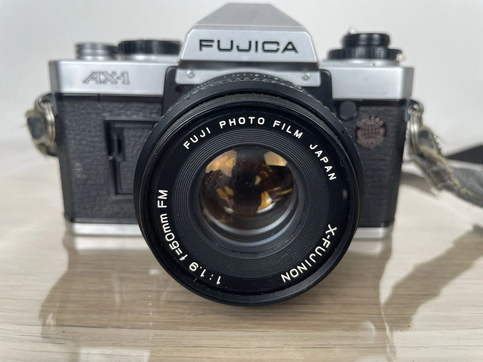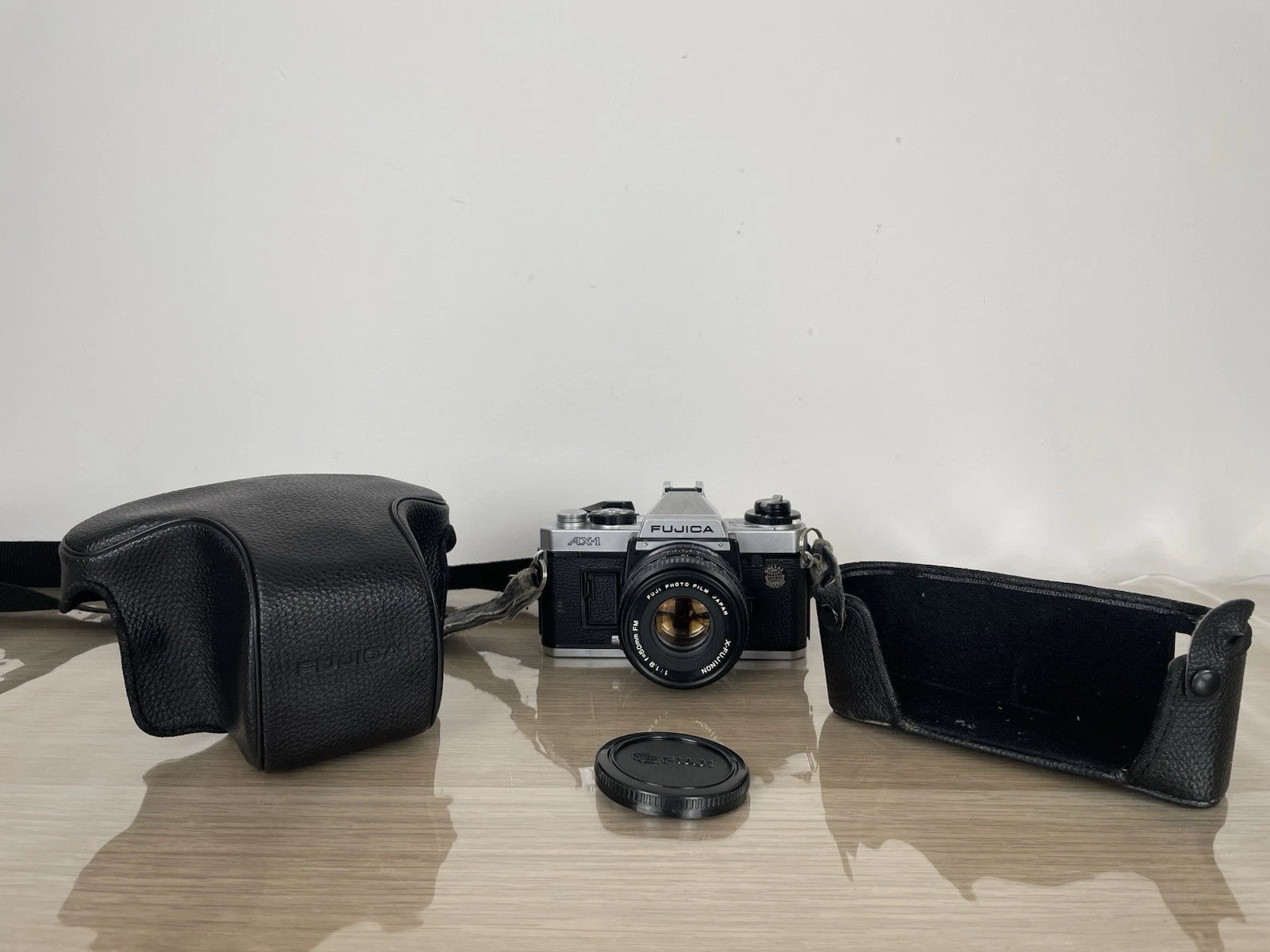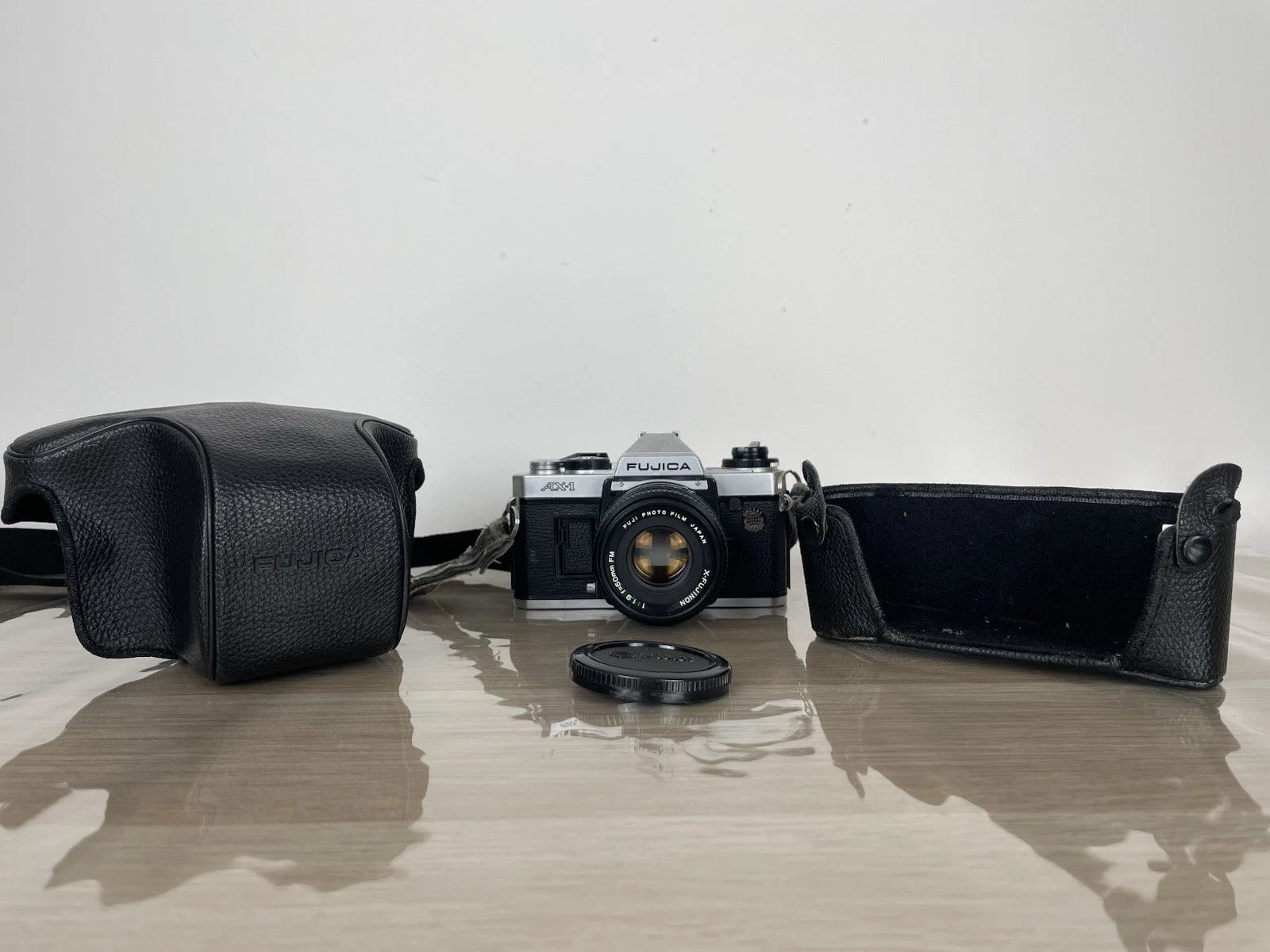 Fotocamera analogica reflex Fujica AX-1, 35mm prodotta in Giappone nel 1979. Colore nero. Dotata di custodia originale, tracolla e coperchio per l'obiettivo. Si vende compresa di obiettivo Fujinon f=50mm FM.