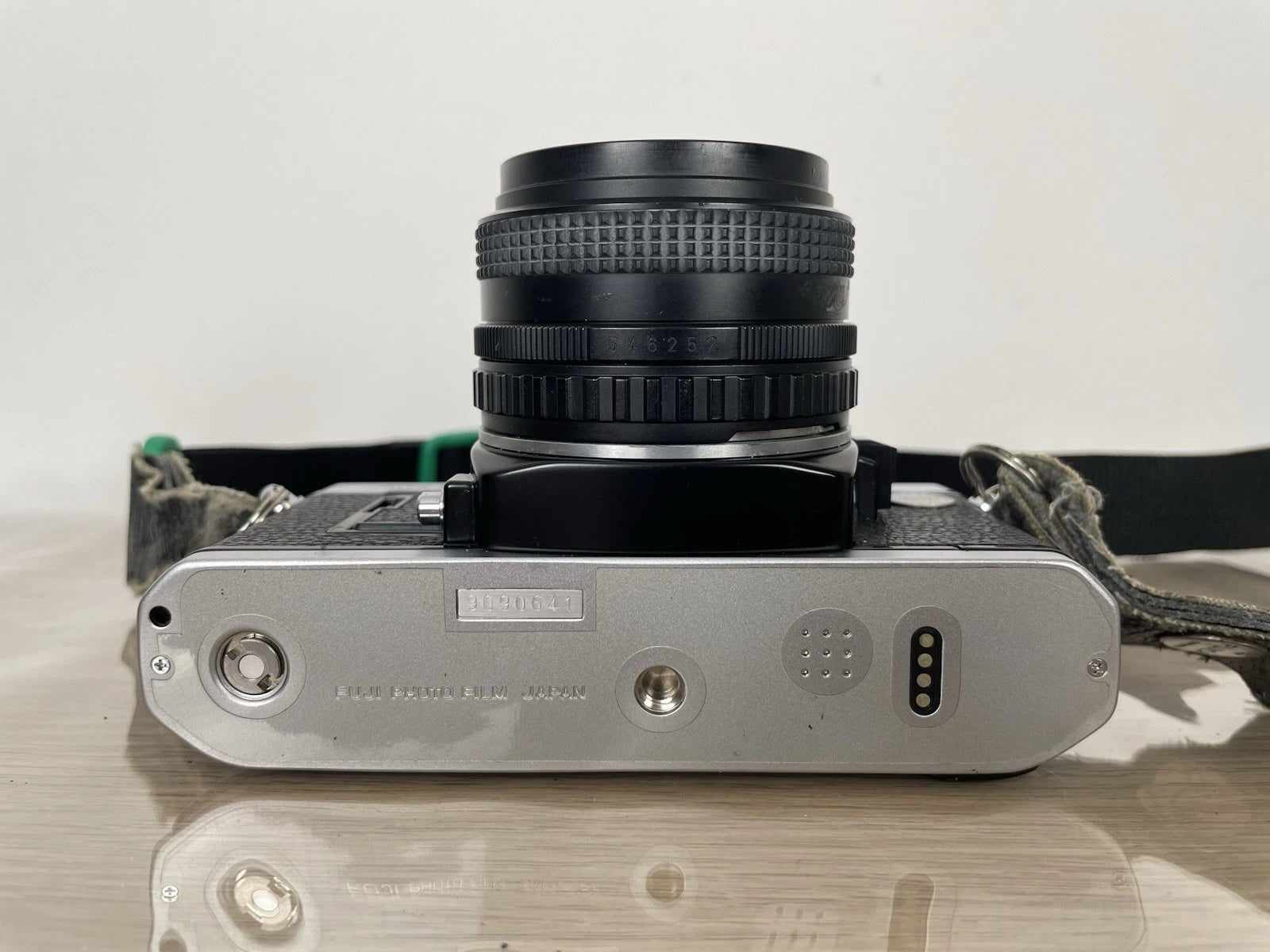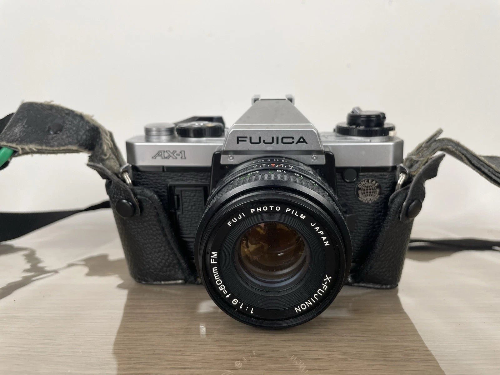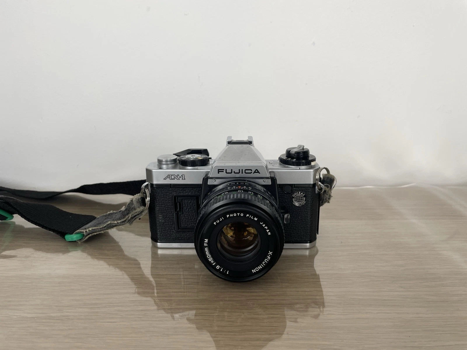 Fotocamera analogica reflex Fujica AX-1, 35mm prodotta in Giappone nel 1979. Colore nero. Dotata di custodia originale, tracolla e coperchio per l'obiettivo. Si vende compresa di obiettivo Fujinon f=50mm FM.