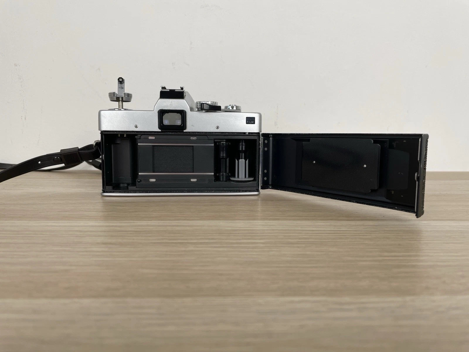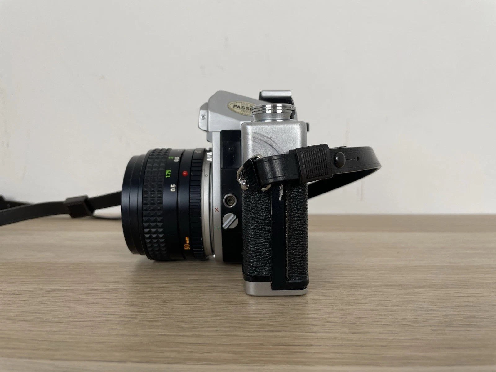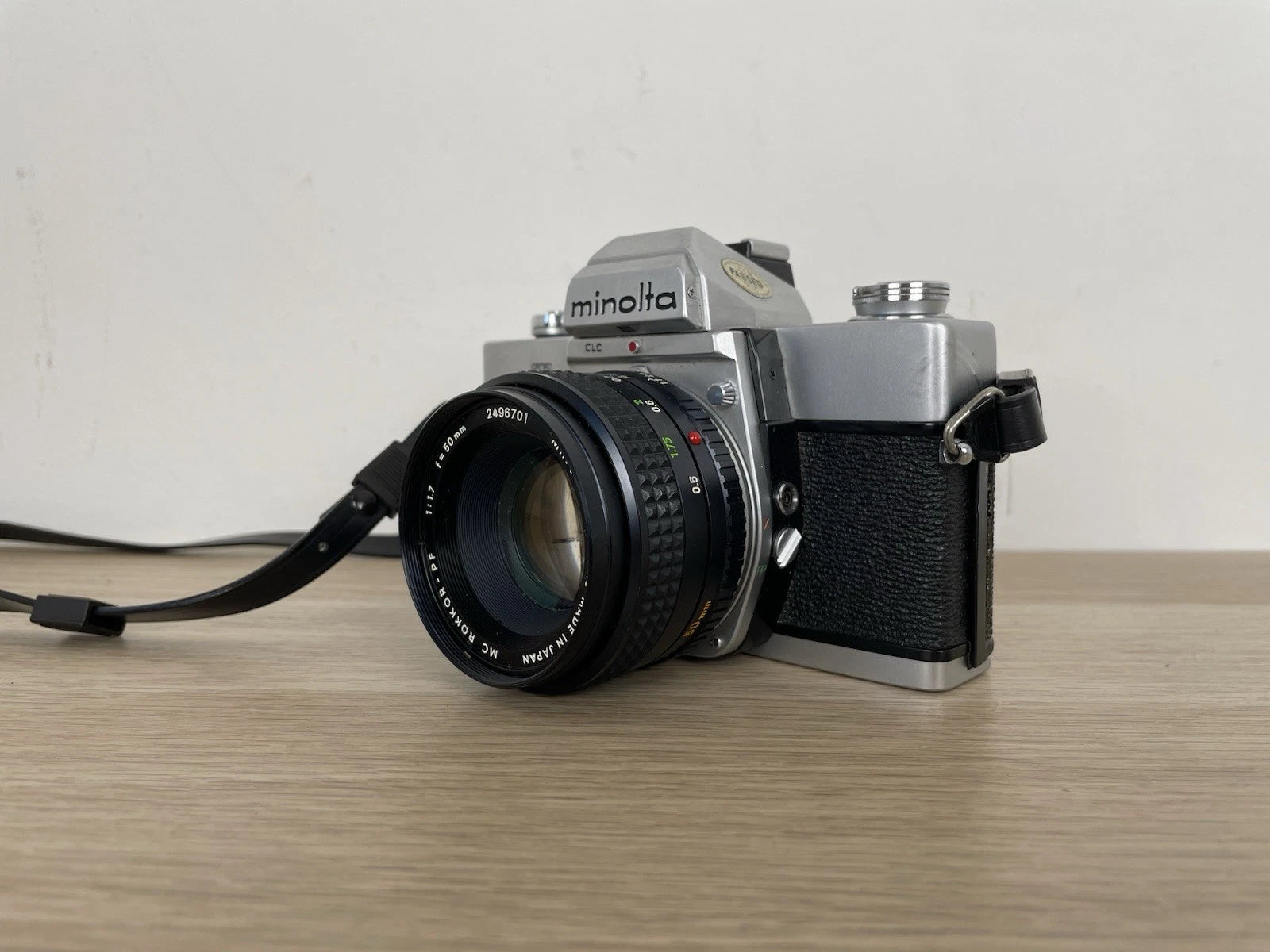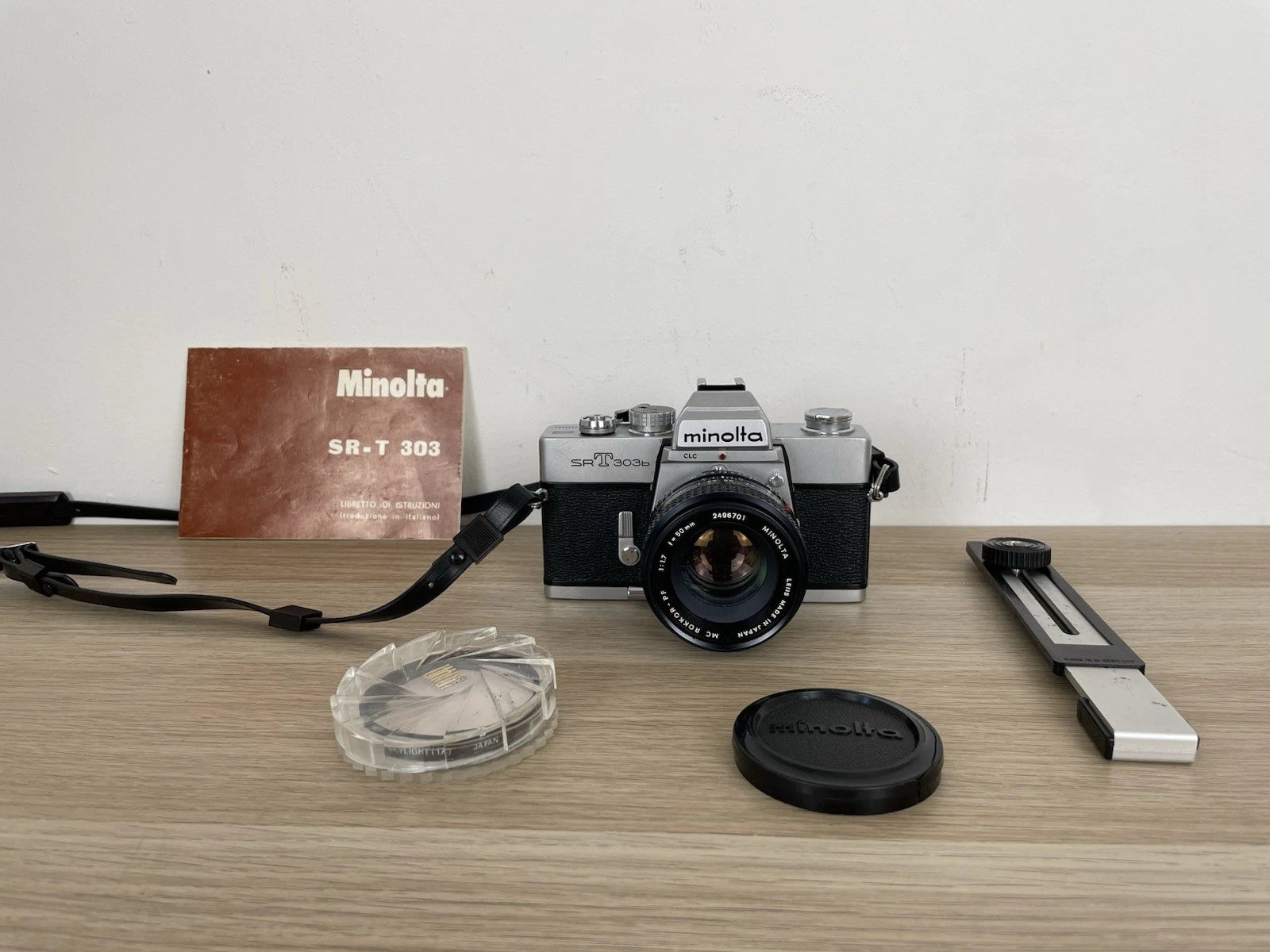 Fotocamera analogica Minolta SRT303B, fabbricata in Giappone dal 1975. Colore nero e argento. Dotata di tracolla, la macchina fotografica pesa 717g. Dimensioni: 146 × 96 × 57 mm. Reflex SLR, 35mm, dotata di obiettivo MC Rokkor - PF, Minolta 1:1,7, f=50mm, numero 2496701.
