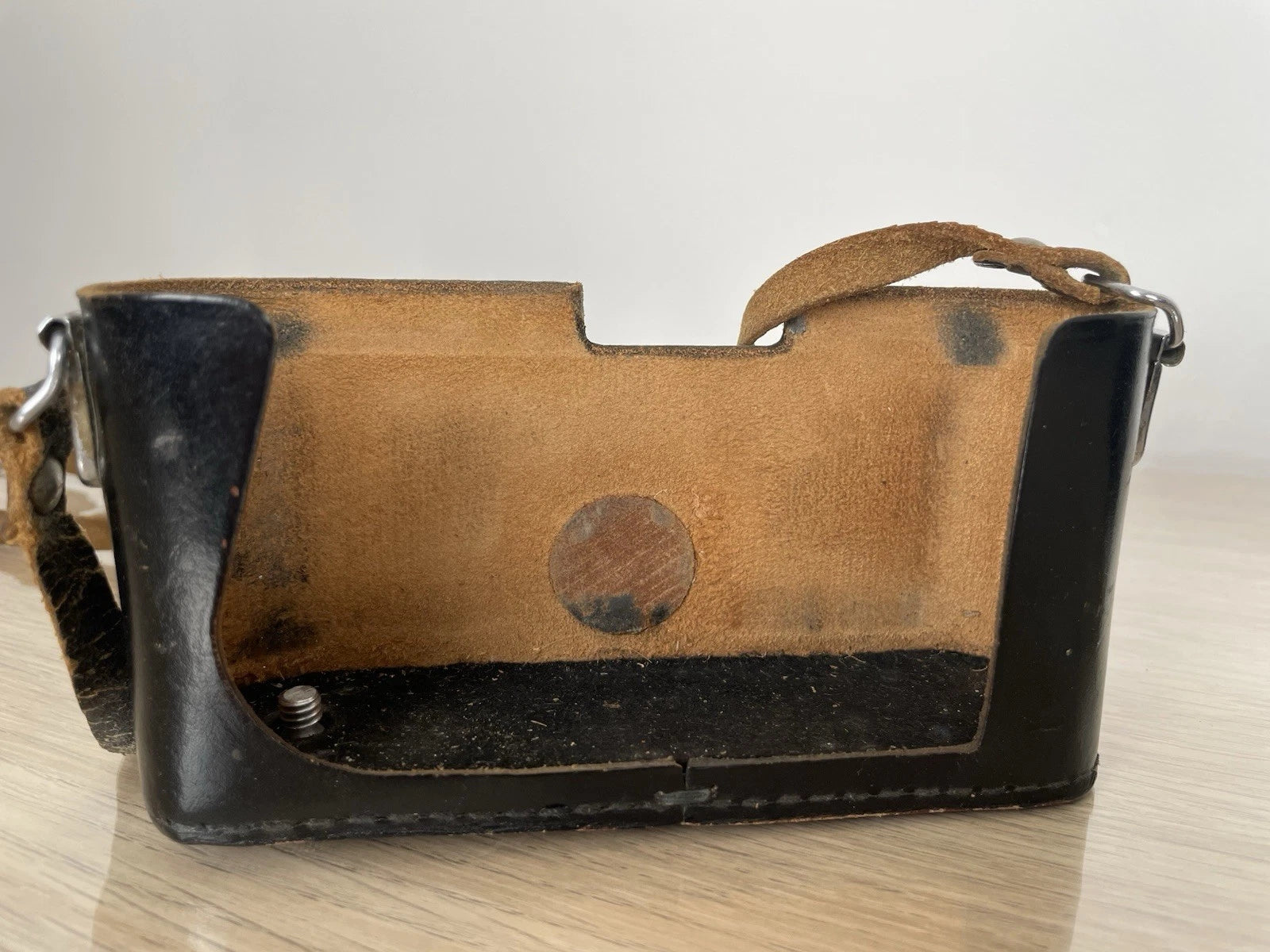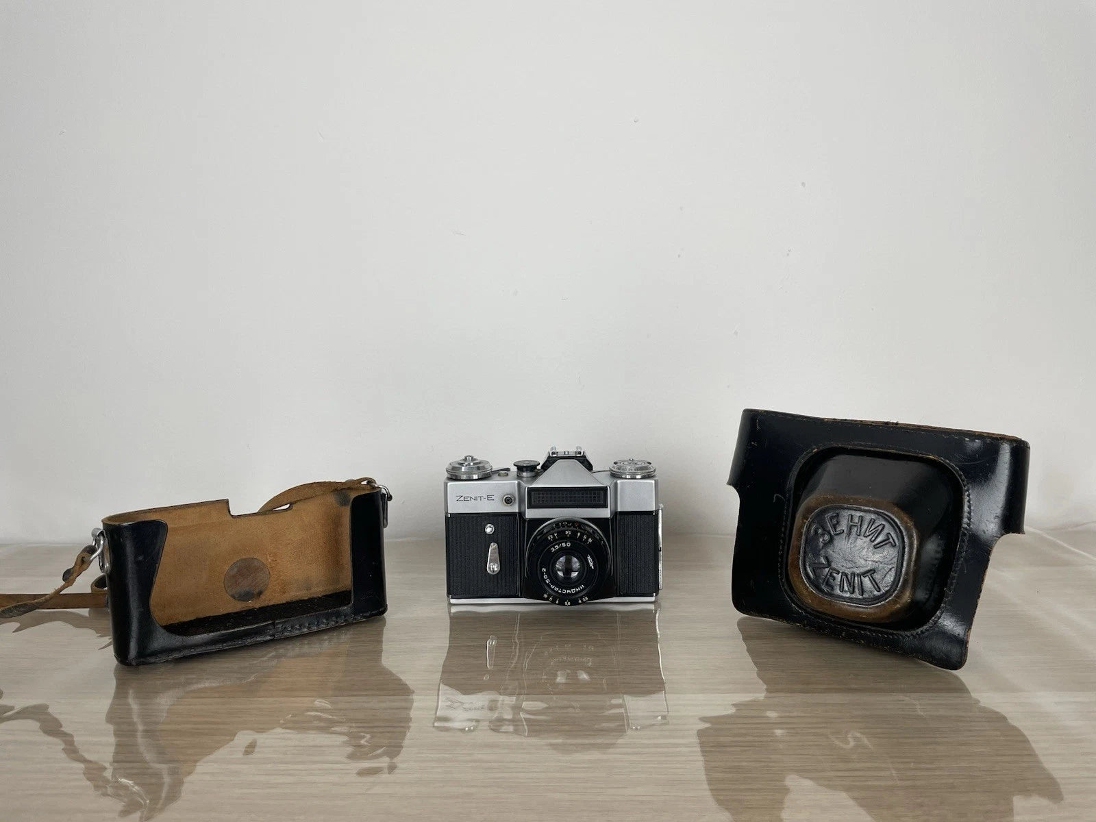 Fotocamera analogica Zenit E, prodotta in Russia tra gli anni '60 e gli anni '80. Colore nero e argento. Dotata di custodia con tracolla.