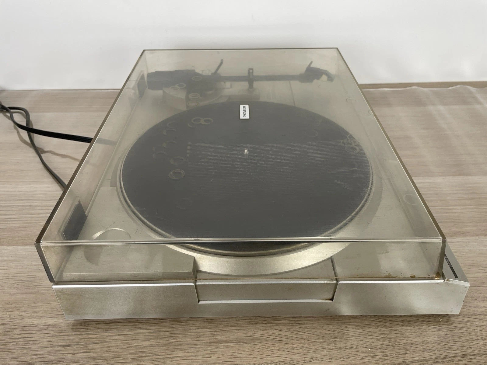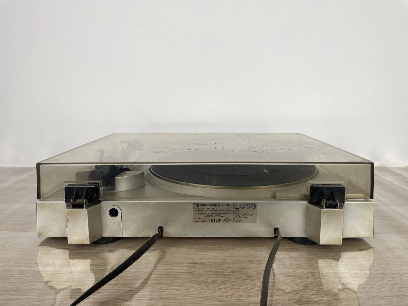 Giradischi Pioneer PL-450, prodotto in Giappone nel 1984 da Pioneer Electronic Corp. Numero di serie: EK66429. 220-240V. Colore argento, coperchio trasparente. Dotato di cavo di alimentazione e cavi RCA.
