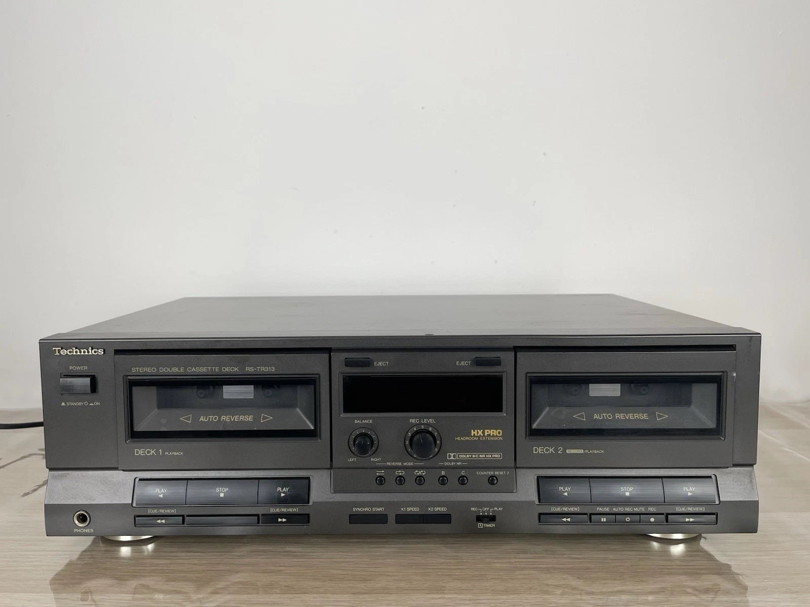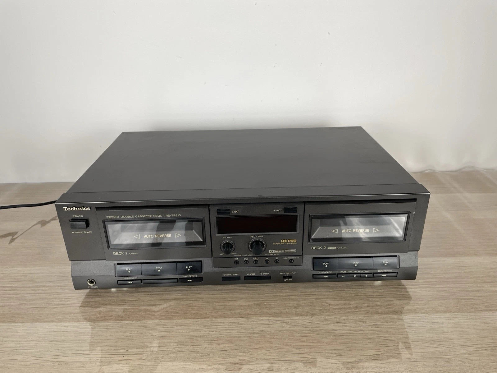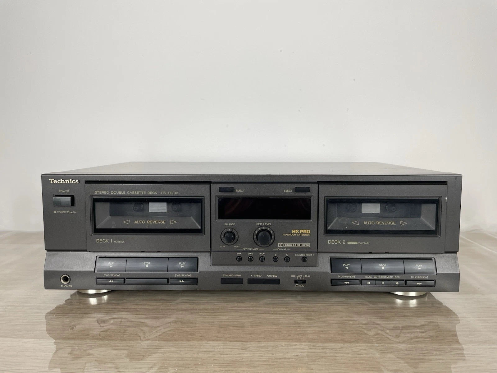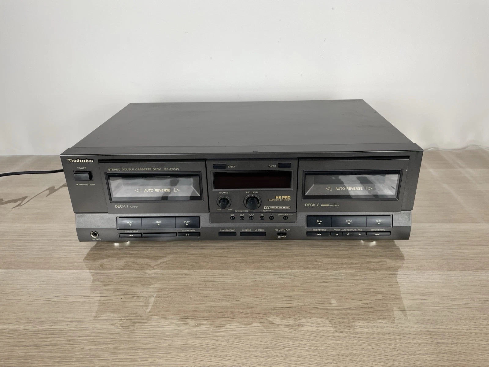 Piastra cassette Technics RS-TR313, colore grigio, prodotto in Giappone nel 1990. Dimensioni (L × A × P): 430 × 125 × 260 mm. Peso: 4,5 kg. Doppia piastra stereo, Deck 1: riproduzione, Deck 2: registrazione + riproduzione, Auto-reverse (su entrambi), doppio motore, controllo elettronico del trasporto (logic control).
