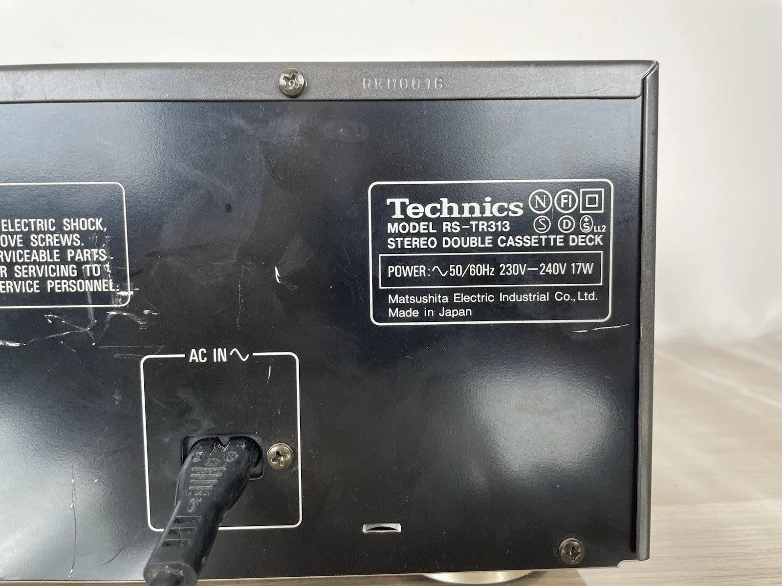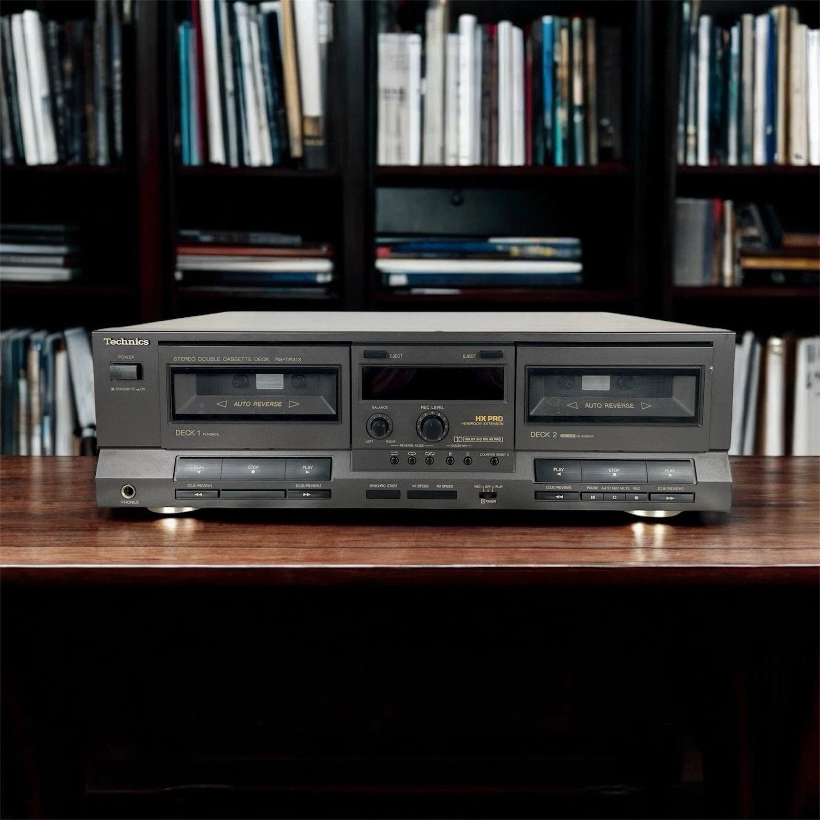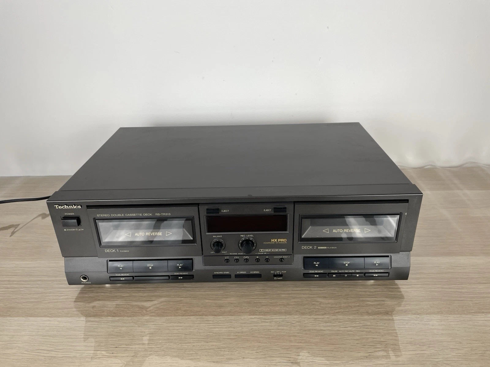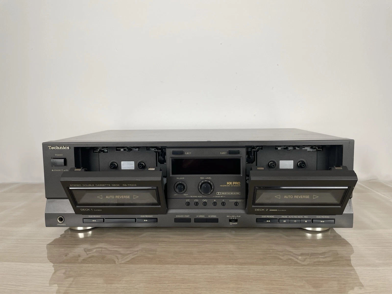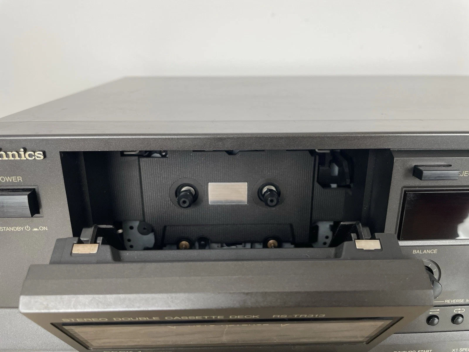 Piastra cassette Technics RS-TR313, colore grigio, prodotto in Giappone nel 1990. Dimensioni (L × A × P): 430 × 125 × 260 mm. Peso: 4,5 kg. Doppia piastra stereo, Deck 1: riproduzione, Deck 2: registrazione + riproduzione, Auto-reverse (su entrambi), doppio motore, controllo elettronico del trasporto (logic control).