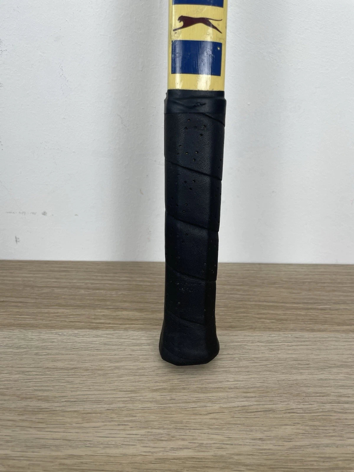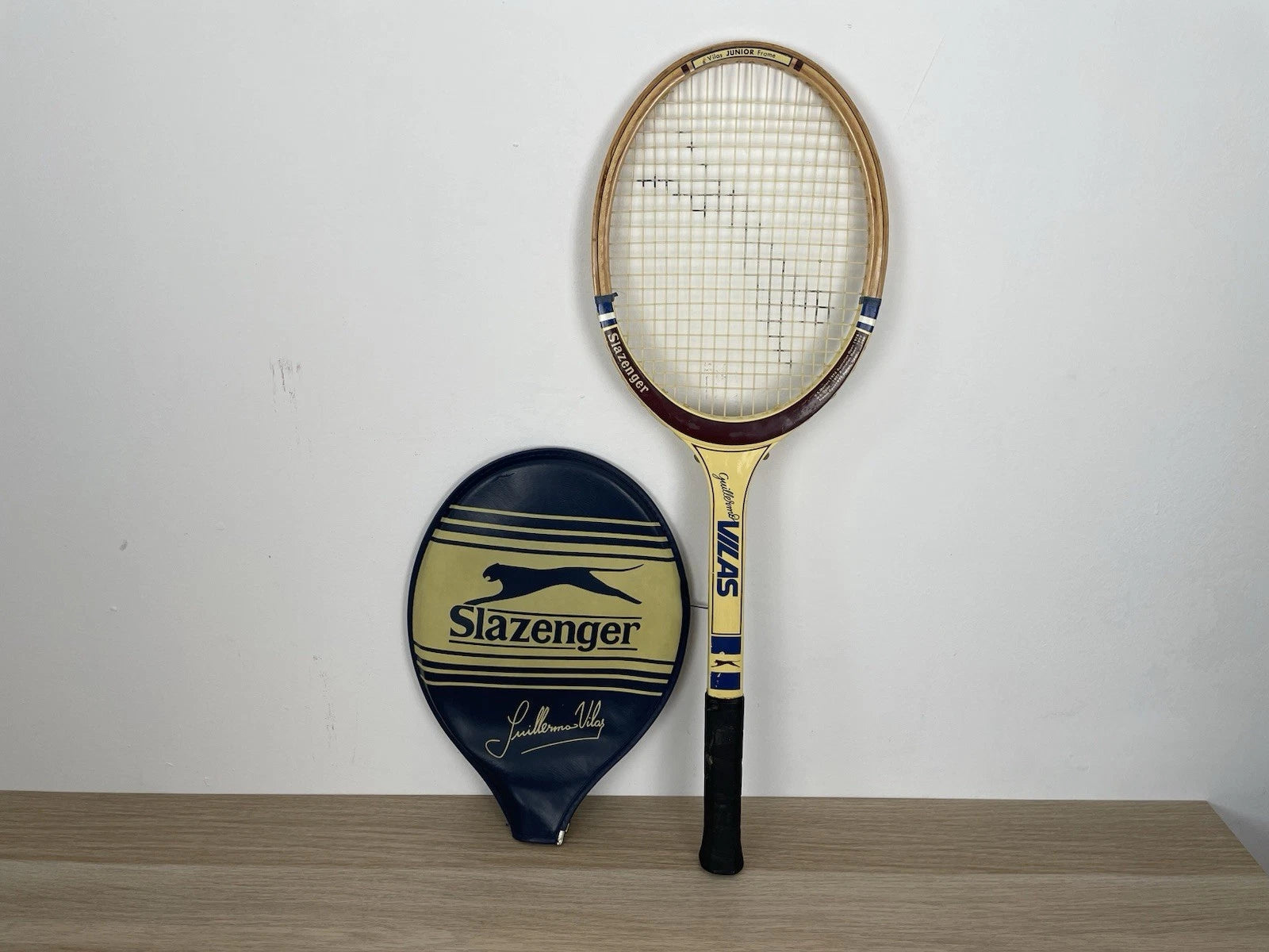 Racchetta da tennis in legno Slazenger, edizione Guillermo Vilas, Junior Frame, misura 41/8", fabbricata in Regno Unito, per bambino o ragazzo, circonferenza manico 10,5 cm (41/8" - L1), con custodia in pelle sintetica di colore blu e beige marchio Slazenger Guillermo Vilas. Epoca anni 70. Modello ispirato al celebre campione argentino Guillermo Vilas, uno dei tennisti più influenti degli anni '70 e '80, noto per il suo stile di gioco potente e la sua dedizione. Materiali: acero, frassino e sycamore, con rinforzi in fibra per una maggiore resistenza.