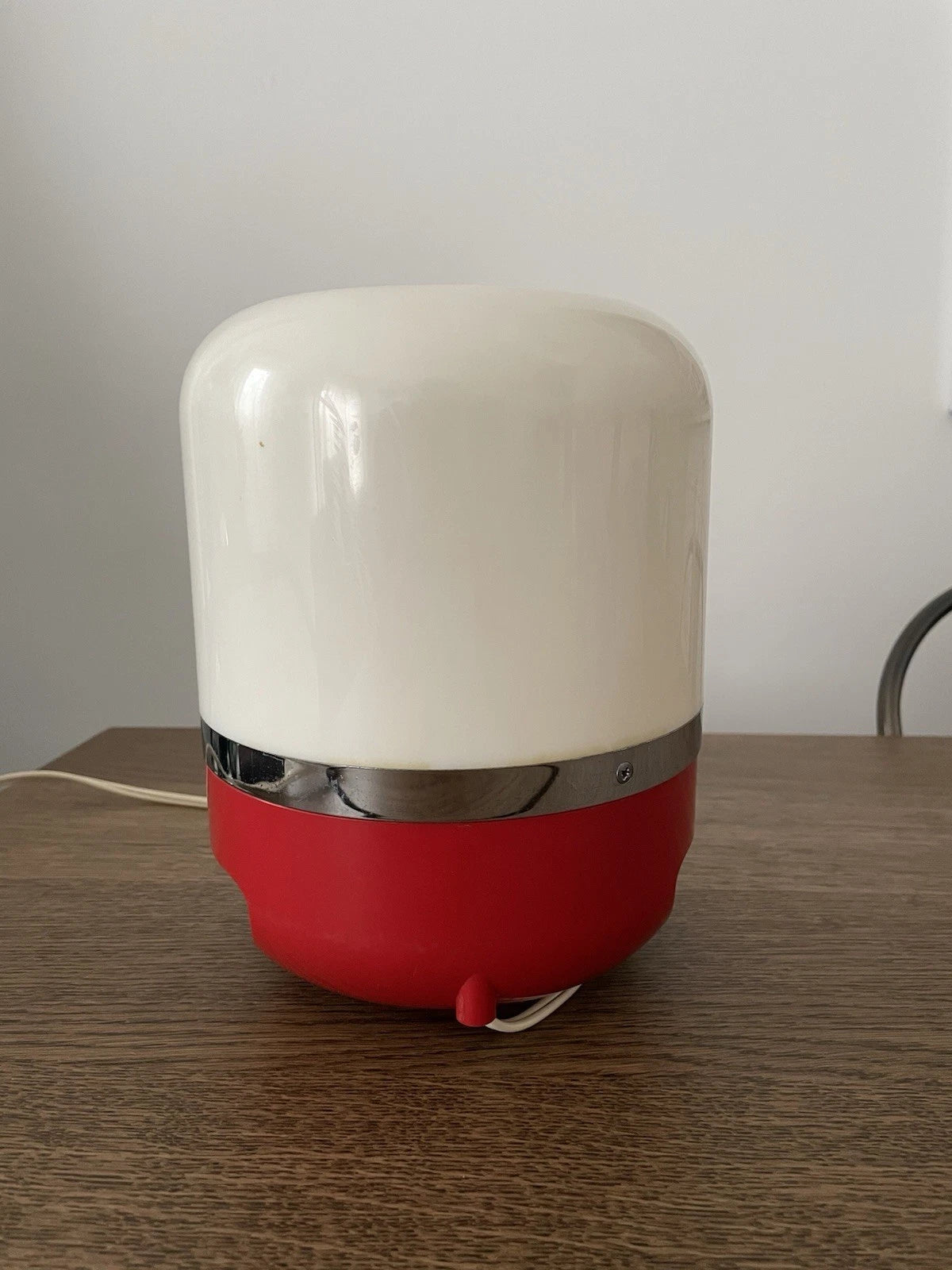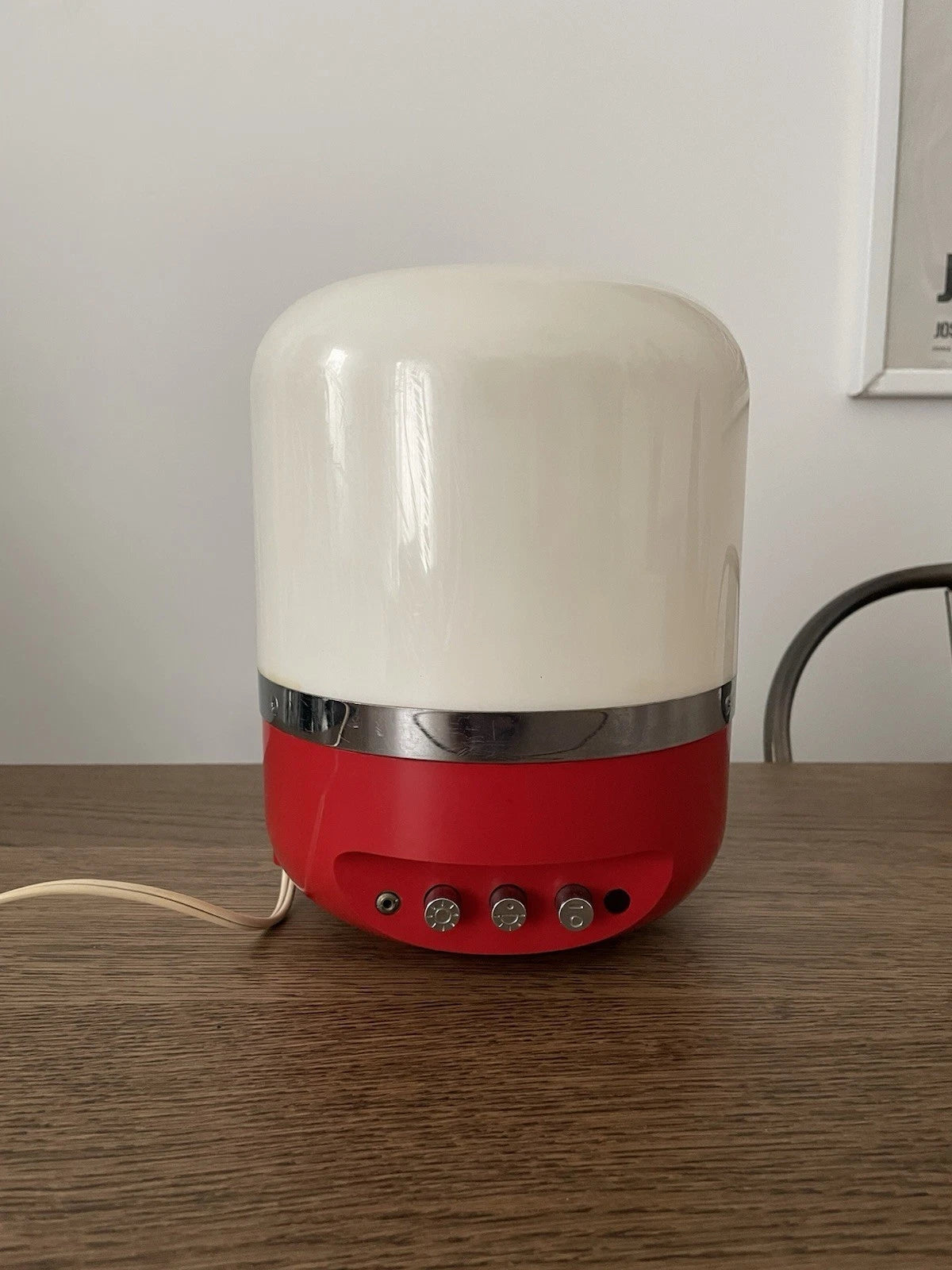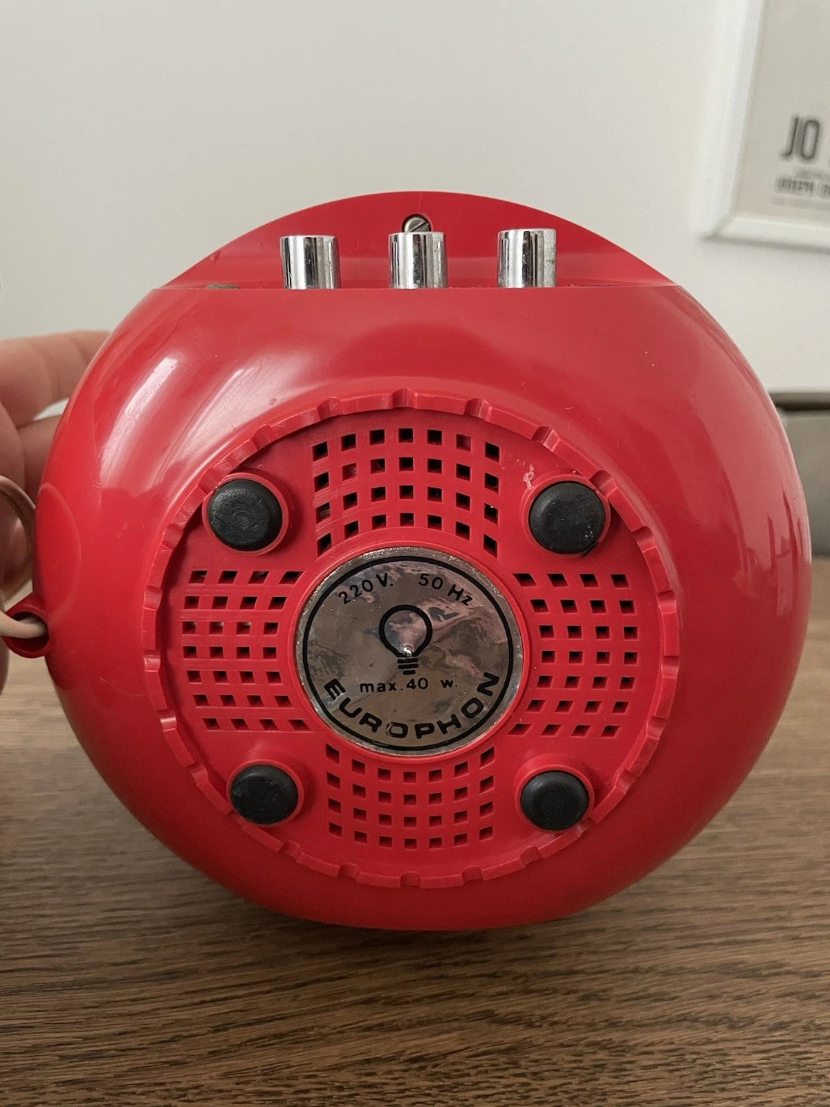 Radio lampada da tavolo Europhon, colore rosso e bianco, design Adriano Rampoldi, epoca anni '60, stile space age. Diametro circa 16–17 cm; peso circa 1,2 Kg.