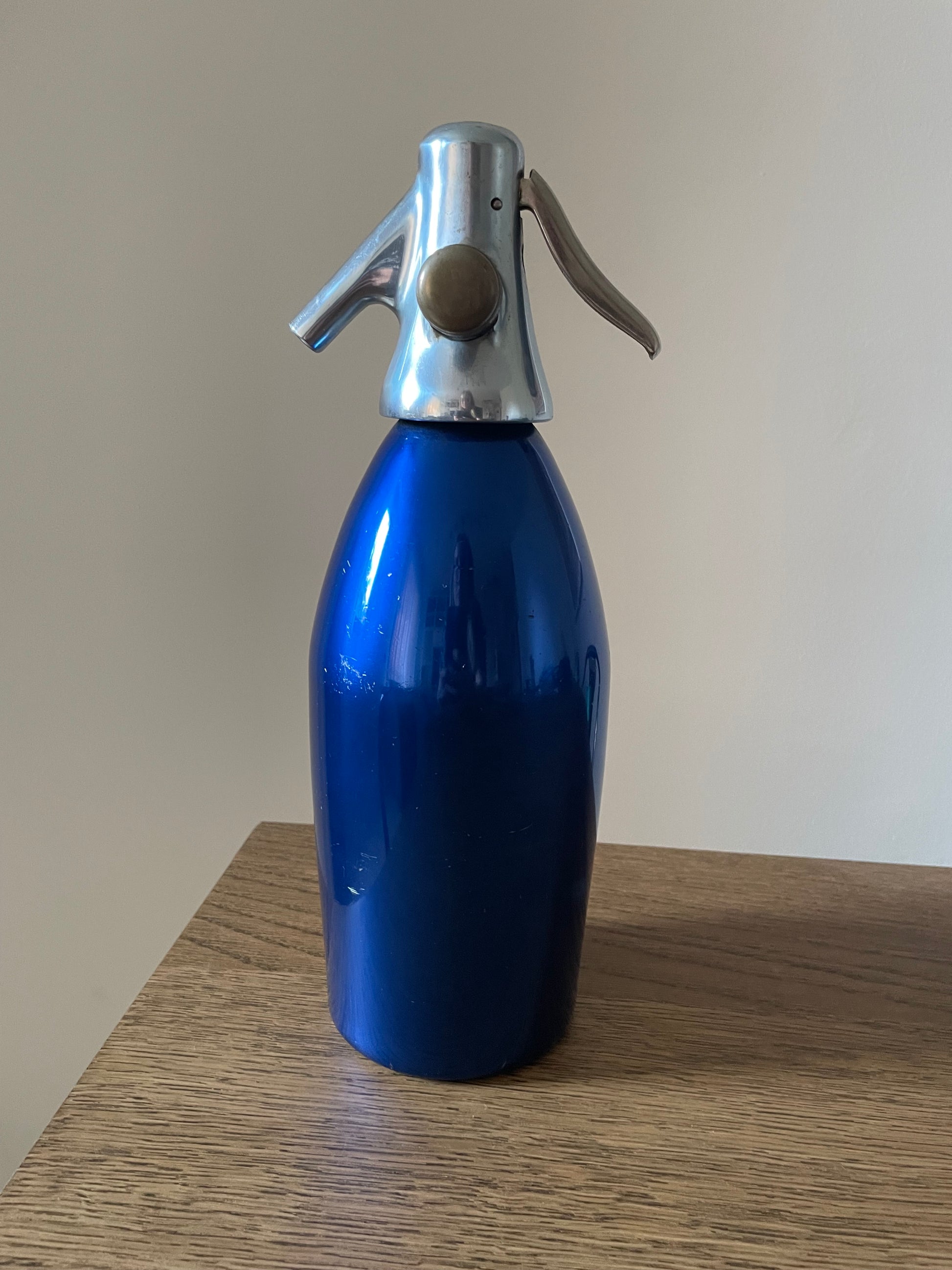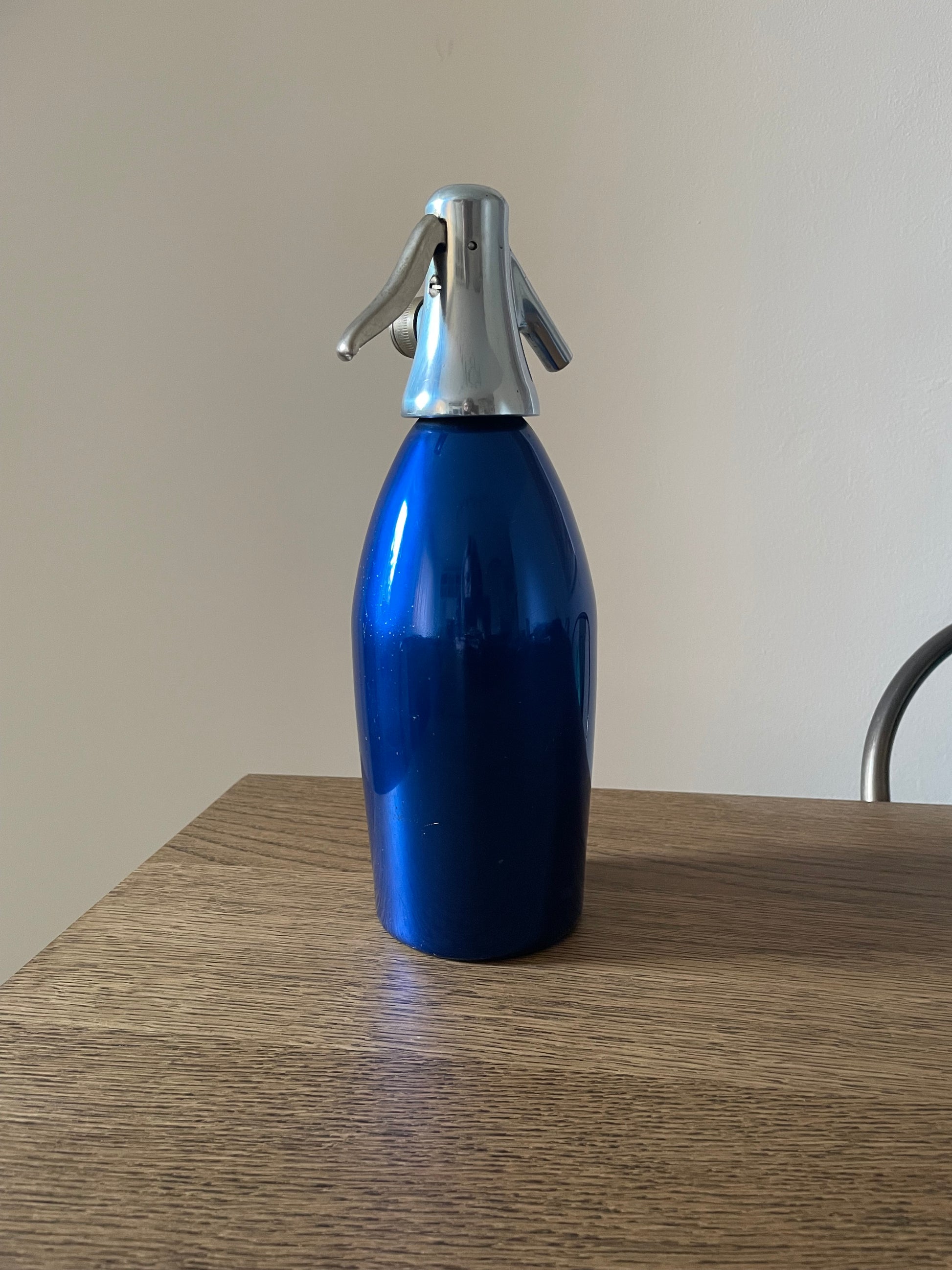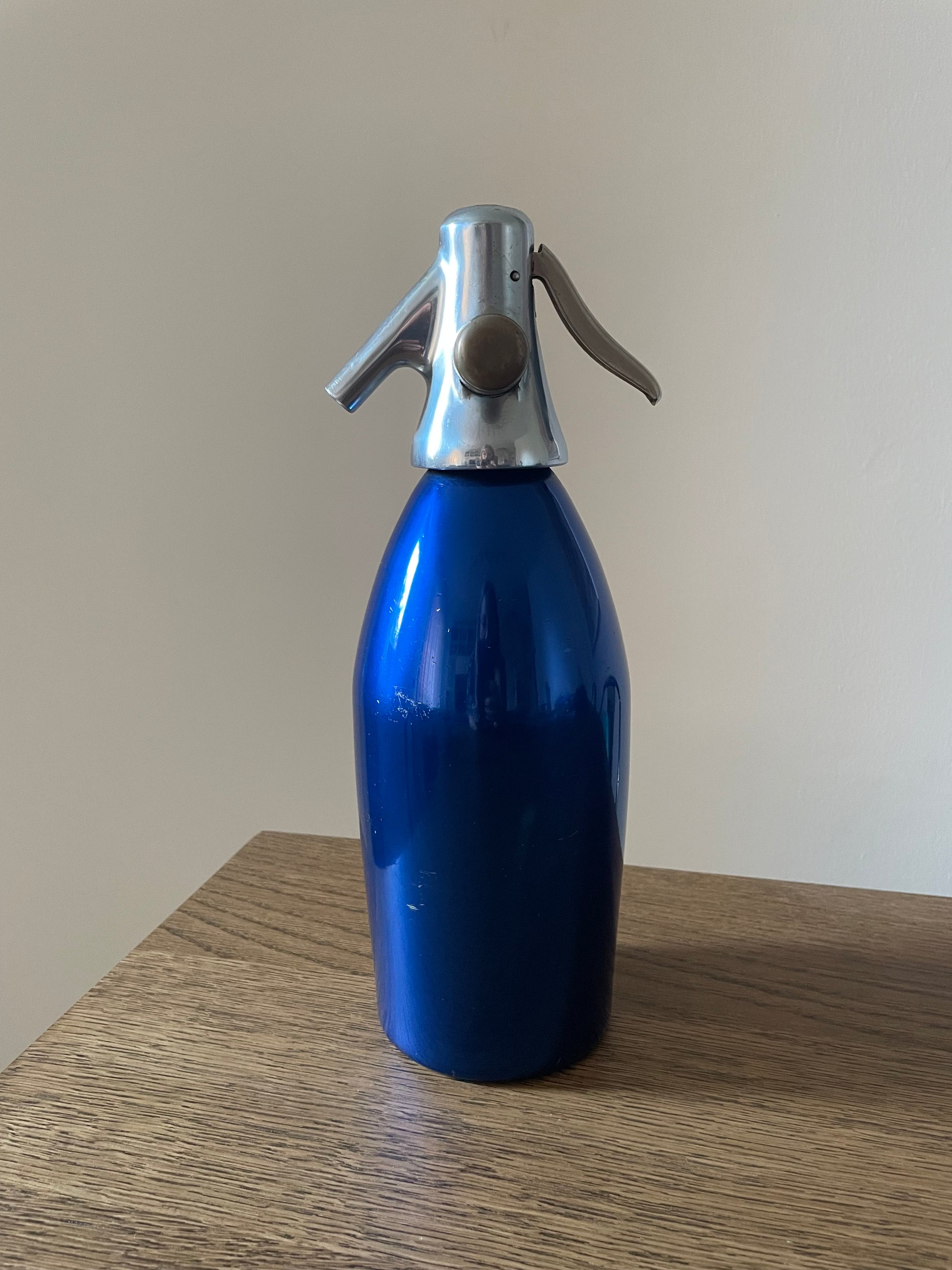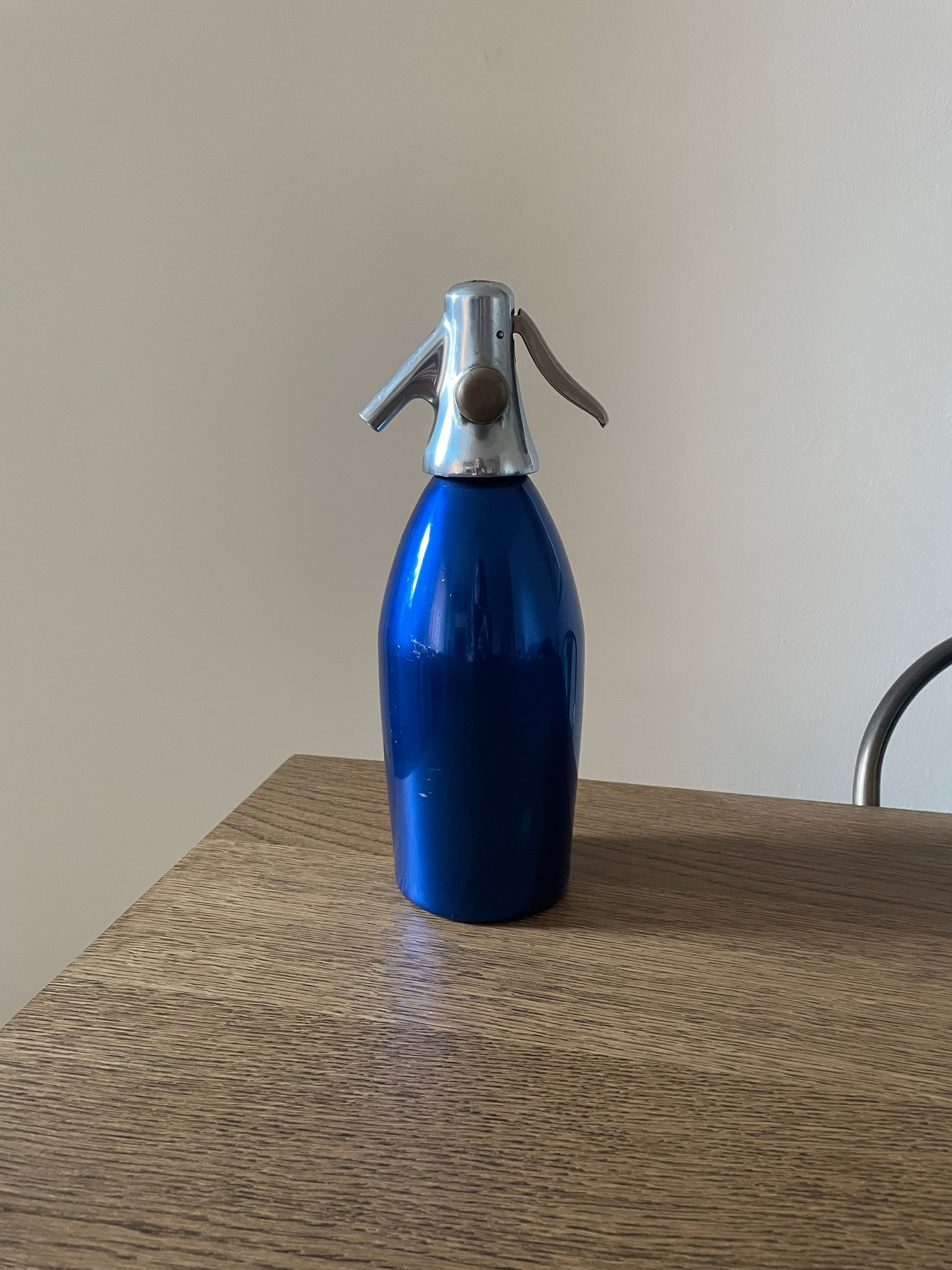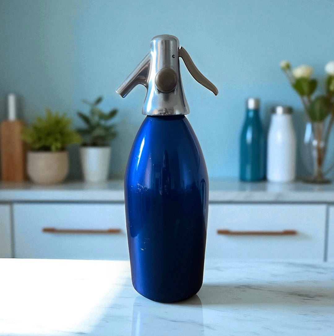 Sifone per seltz dello storico marchio SACCAB Milano, Vintage, Epoca Anni 50, di colore blu, disegnato da Sergio Asti, vincitore del Compasso D’Oro nel 1962.