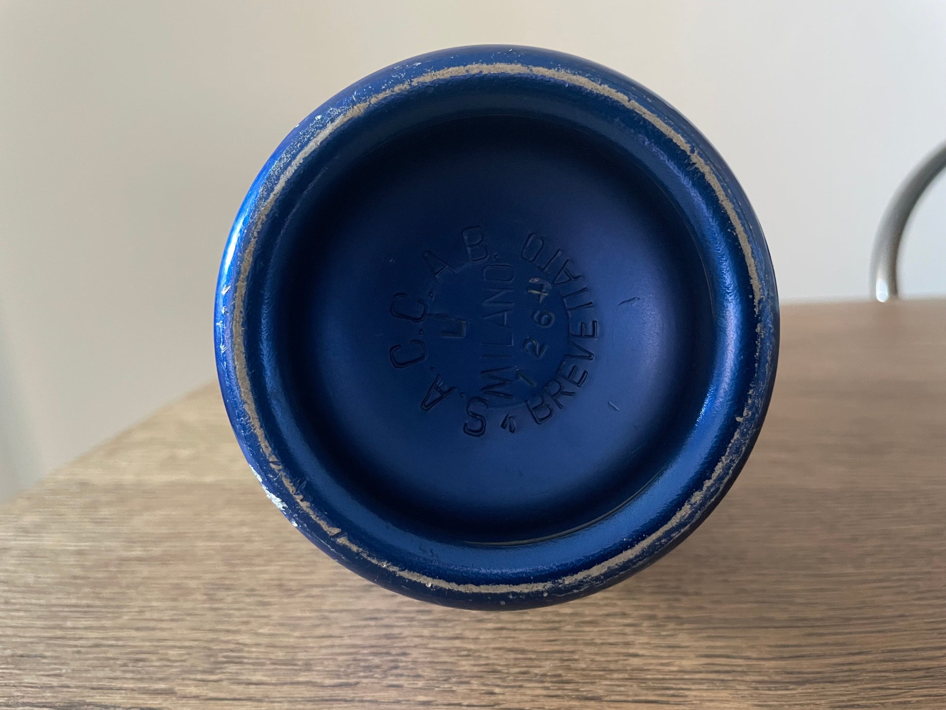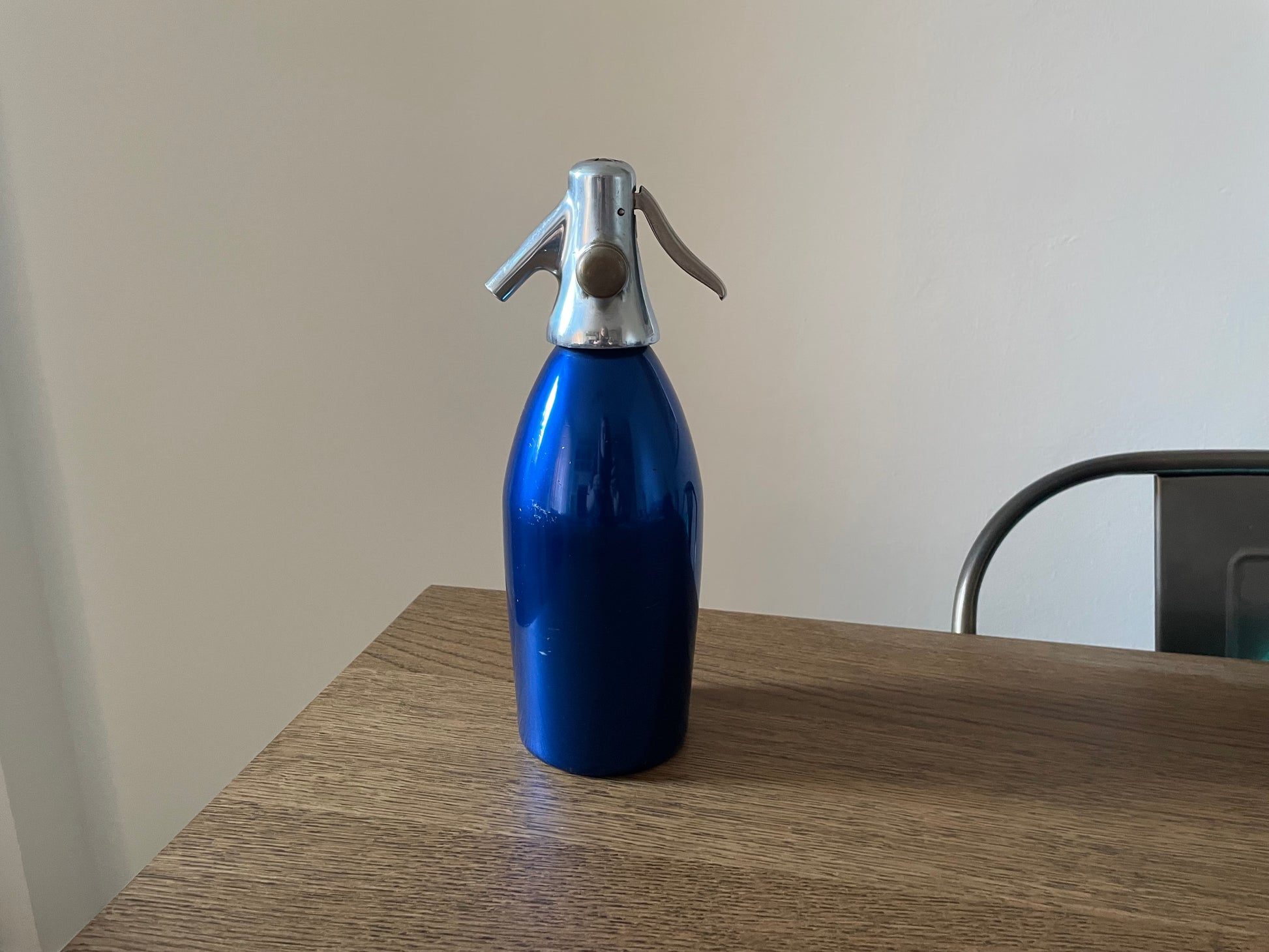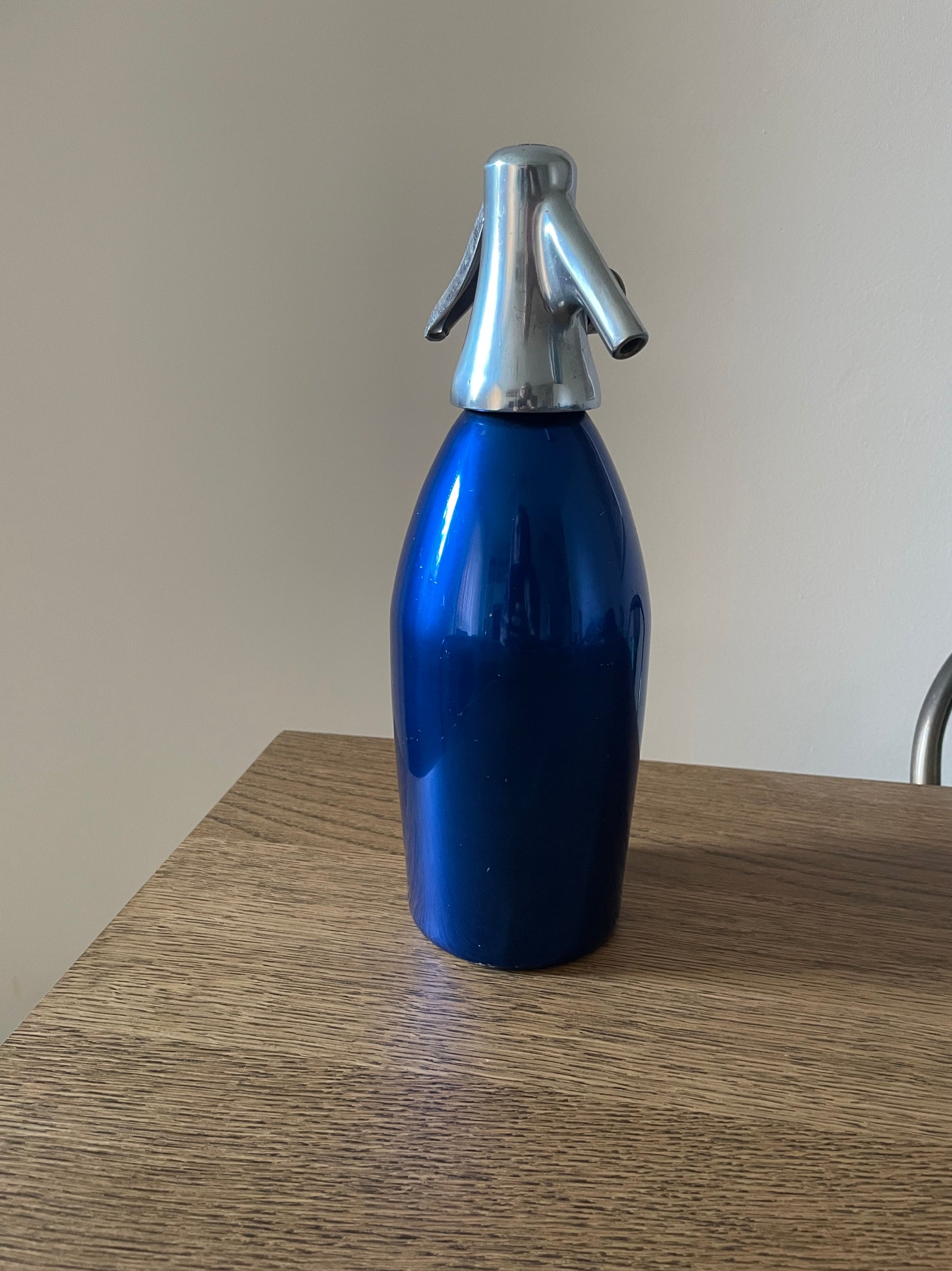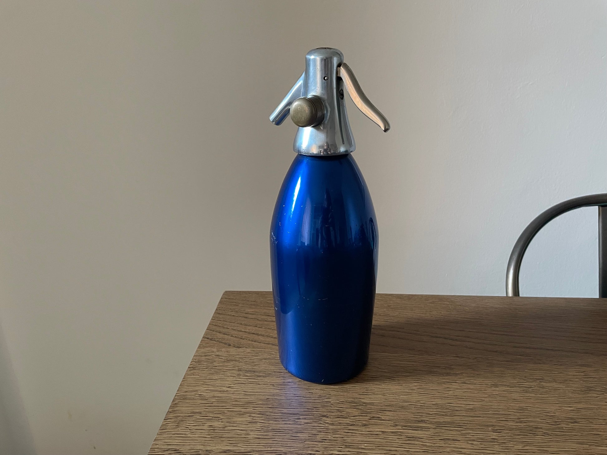 Sifone per seltz dello storico marchio SACCAB Milano, Vintage, Epoca Anni 50, di colore blu, disegnato da Sergio Asti, vincitore del Compasso D’Oro nel 1962.
