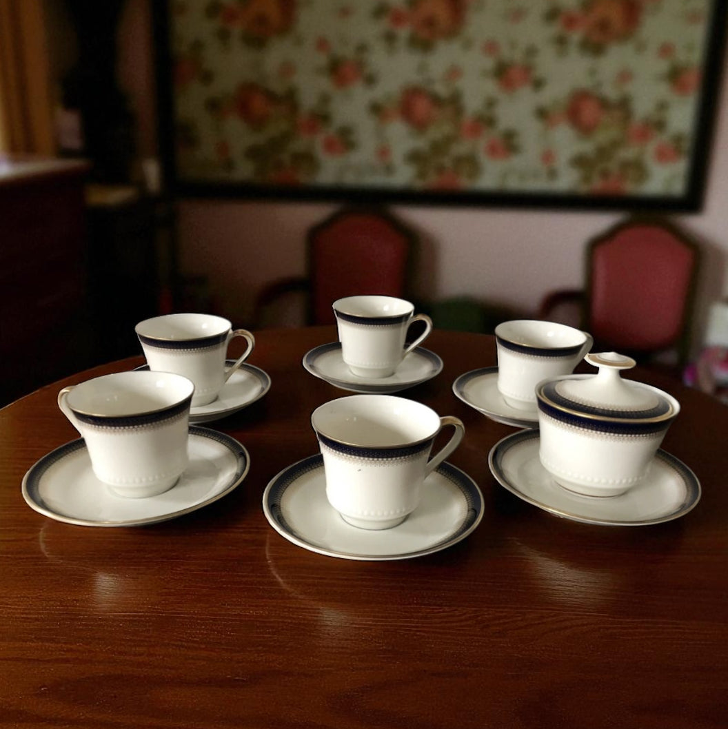 Servizio da the Mitterteich Bavaria in porcellana con decoro oro e blu sui bordi. Il servizio è composto da 5 tazze, 6 piatti e zuccheriera.