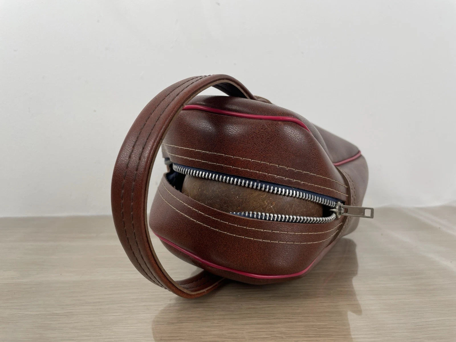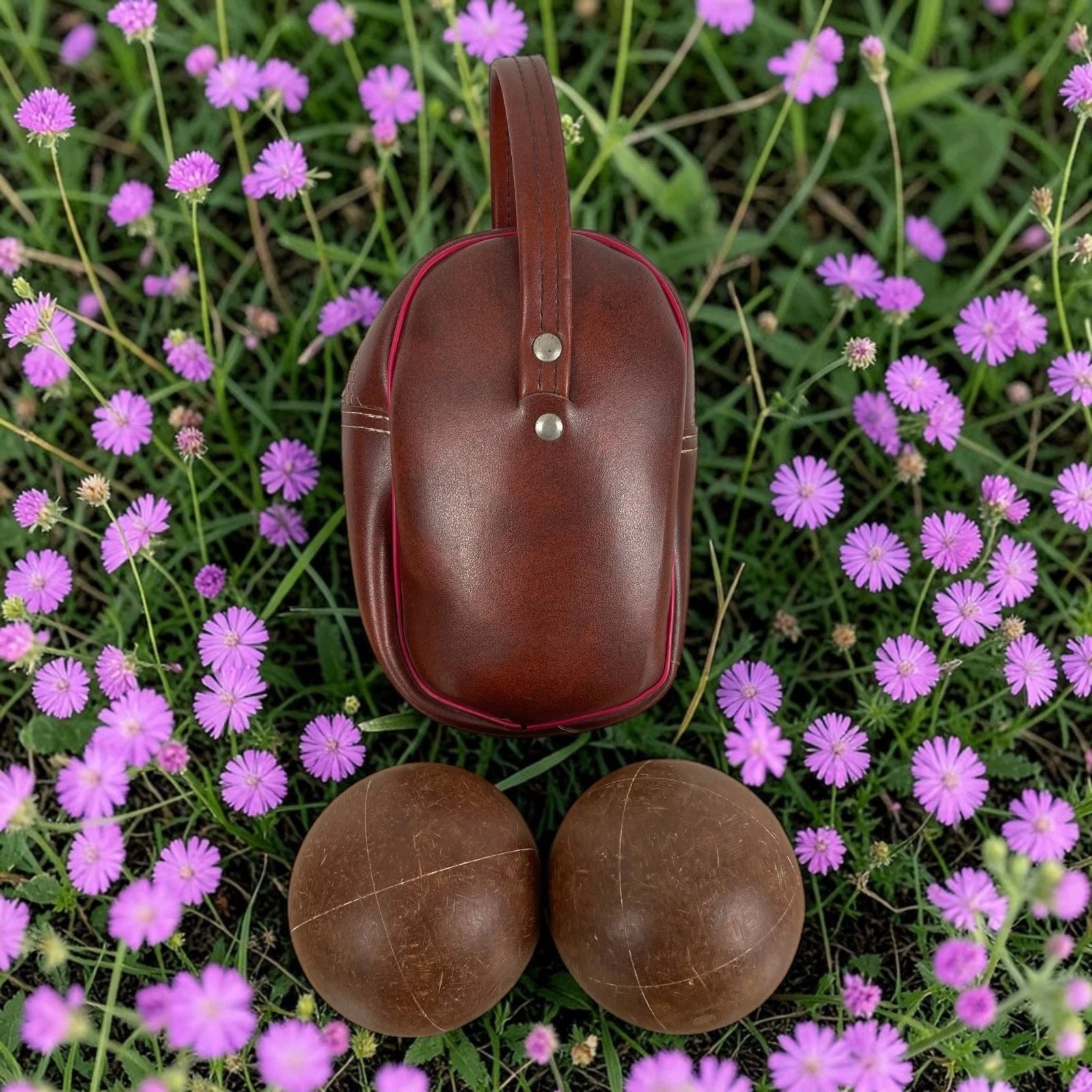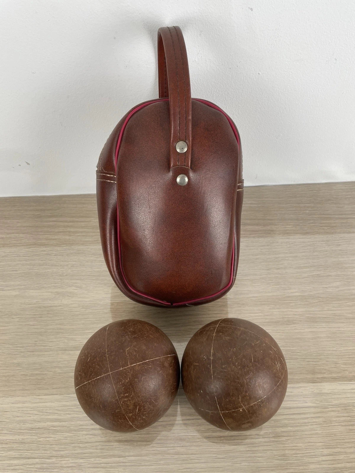 Set di 2 bocce da gioco professionali, con custodia a corredo vintage, colore marrone con inserti di colore rosso, con zip a chiusura e pezzuola per lucidatura.