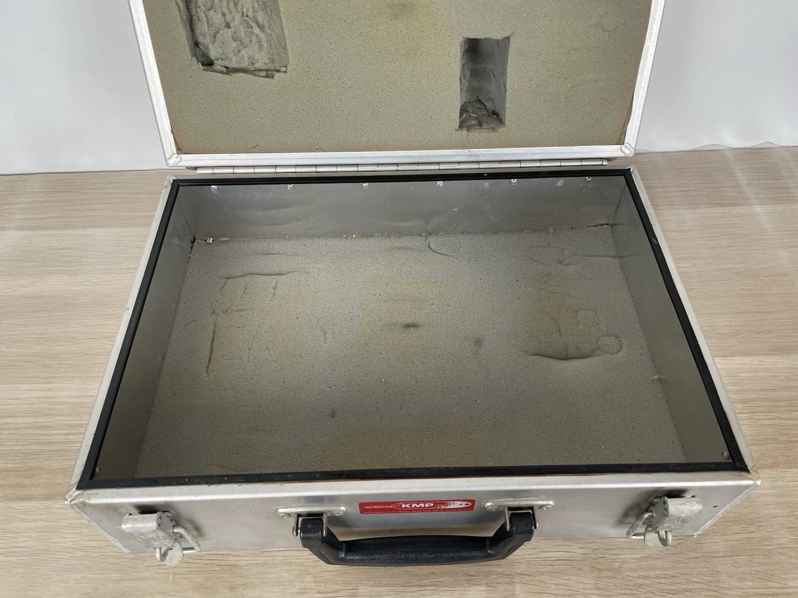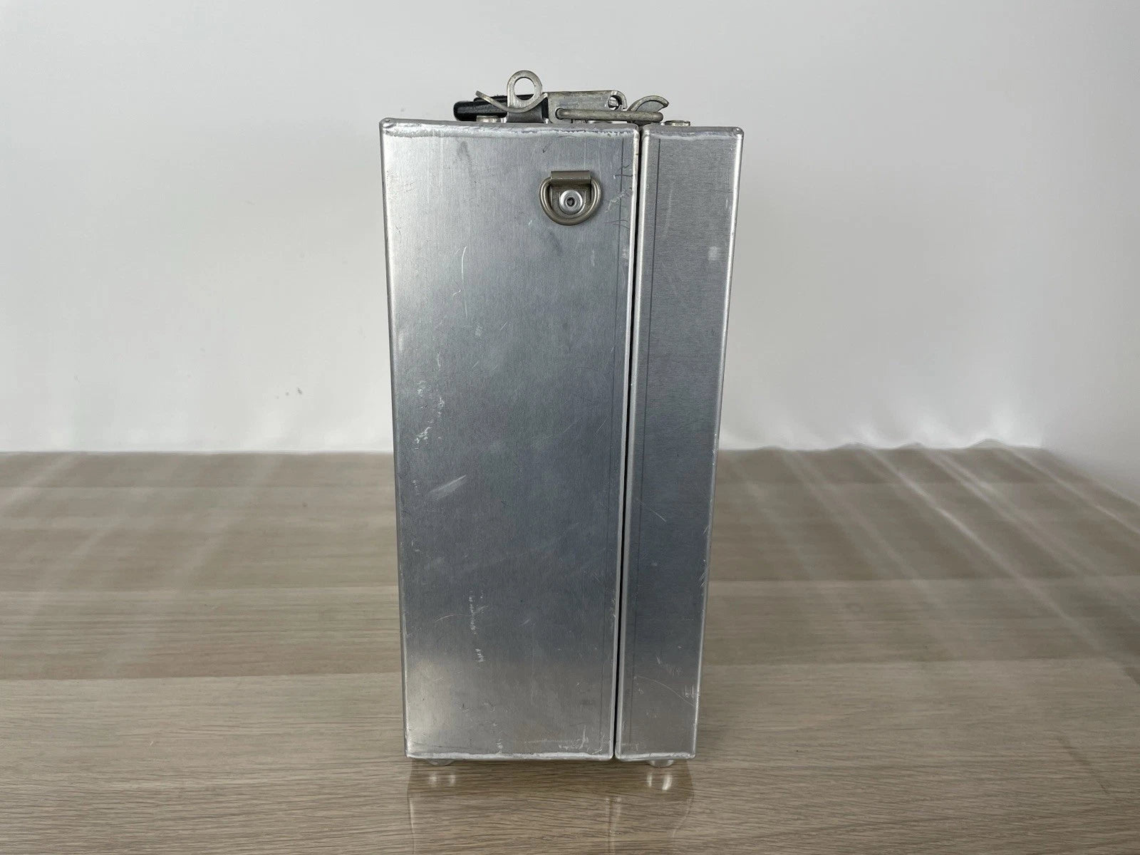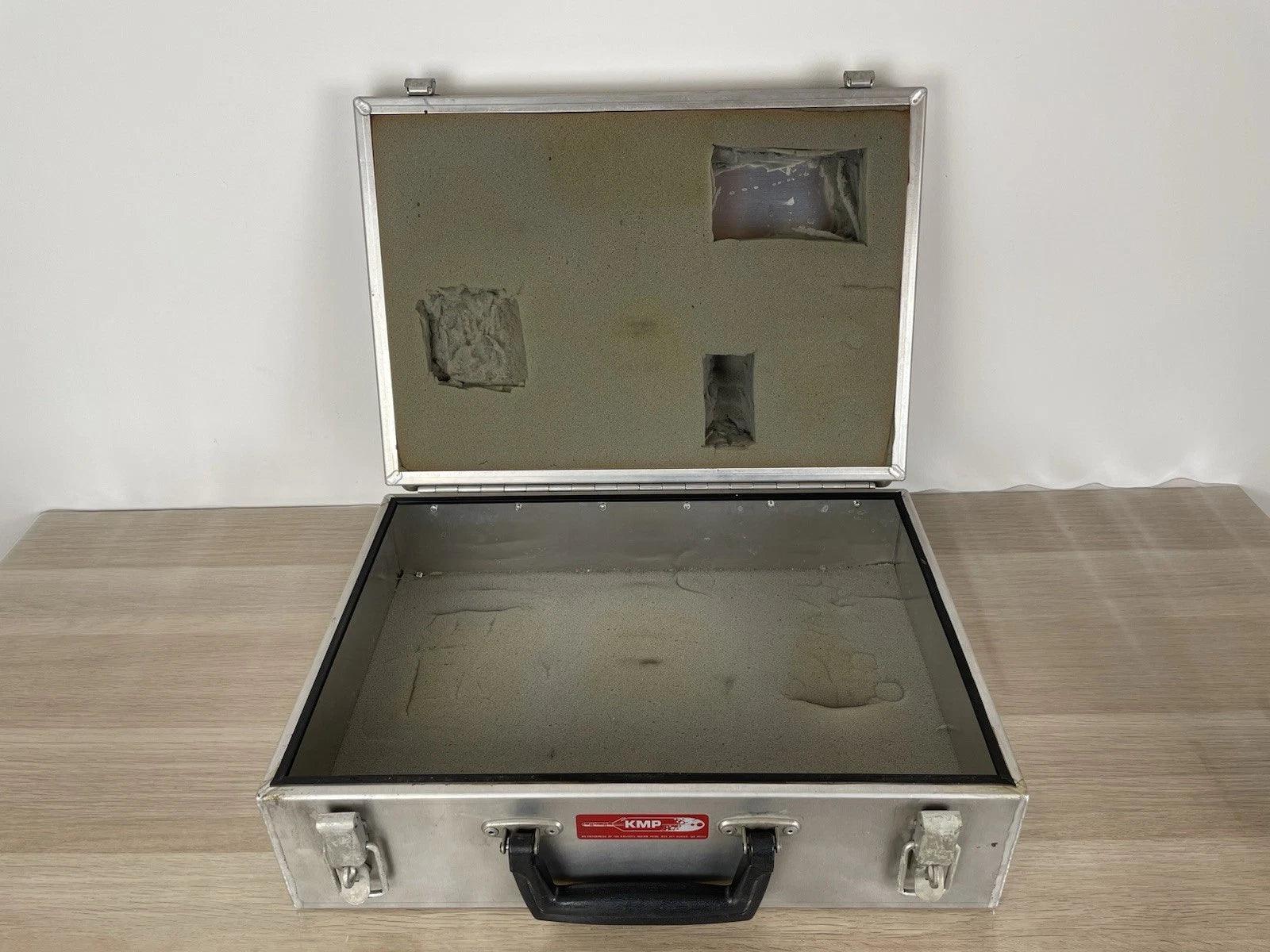 Valigia tecnica professionale KPM in metallo, di produzione vintage, realizzata per il trasporto e la protezione di strumentazione sensibile.La valigia è costruita in metallo (probabilmente alluminio o lega leggera) ed è dotata di chiusure robuste e guarnizione perimetrale, caratteristiche tipiche dei contenitori tecnici progettati per proteggere il contenuto da polvere, umidità e urti. Questa tipologia di valigette era comunemente utilizzata nella seconda metà del Novecento per attrezzatura fotografica analogica, strumenti ottici, apparecchiature tecniche o scientifiche, materiali professionali delicati.